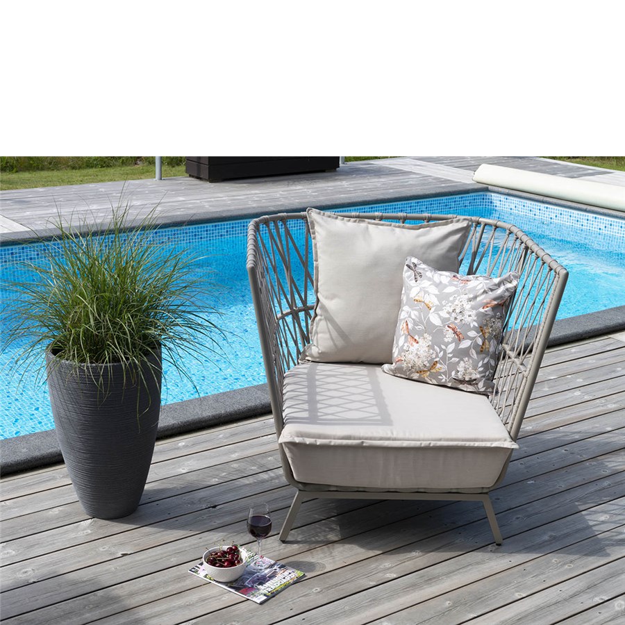 Loungegrupp Jetset med flätade olefinband på beige aluminiumstomme. Priset avser fåtölj med dynor.