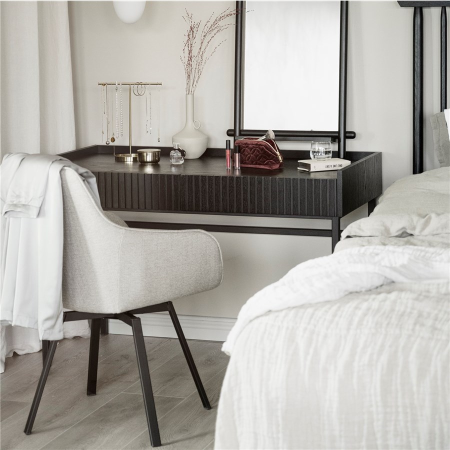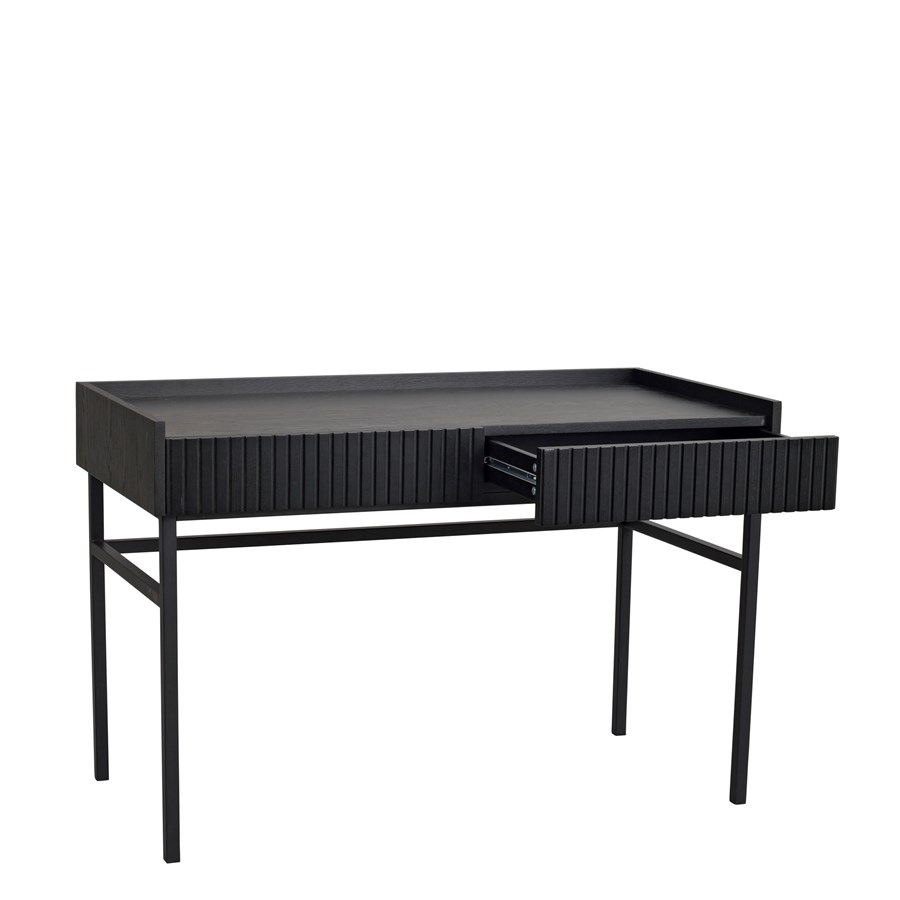 Halifax skrivbord i svartlackad ek och svarta metallben. Passar perfekt till hemmakontoret eller som sminkbord. Välj själv om du vill montera de medföljande guldfärgade knopparna i borstad metall.