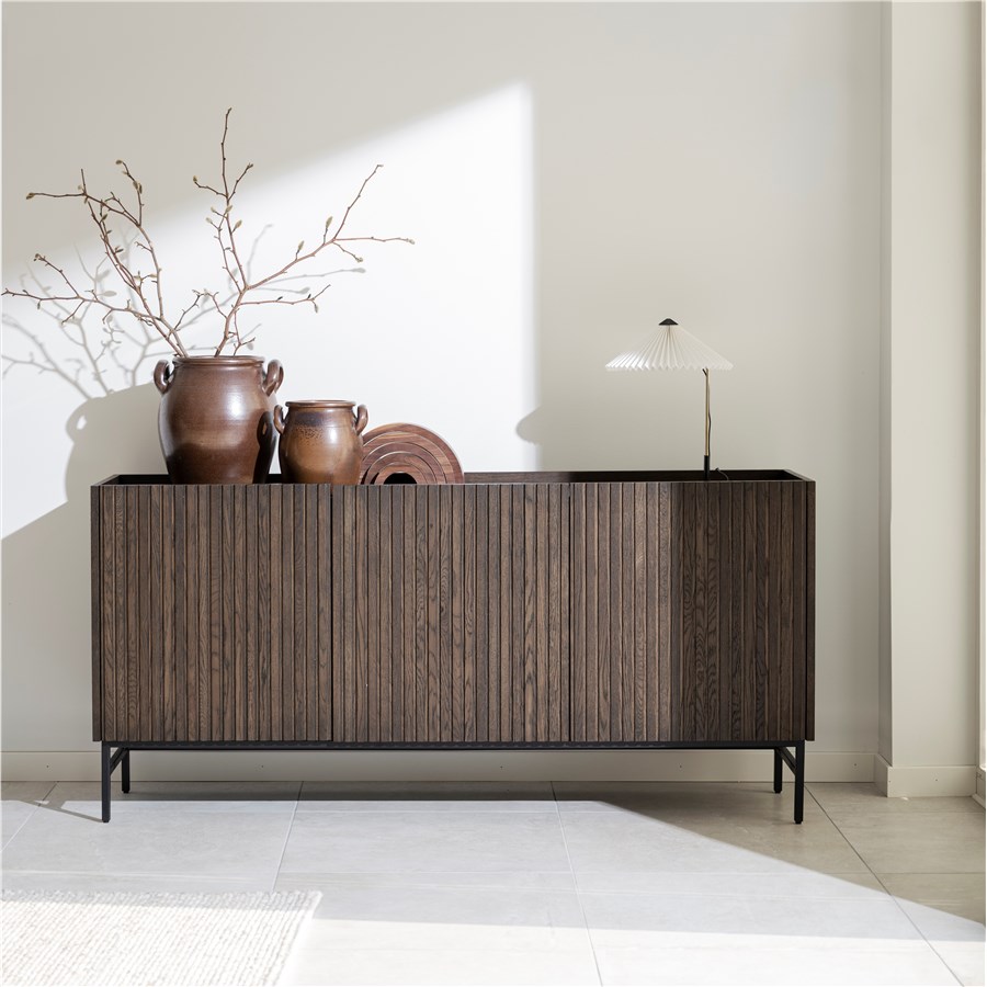 Halifax sideboard i brunlackad ek och svarta metallben. Dörrarna har mjukstängande soft-close funktion och kan därför användas med eller utan de medföljande knopparna.