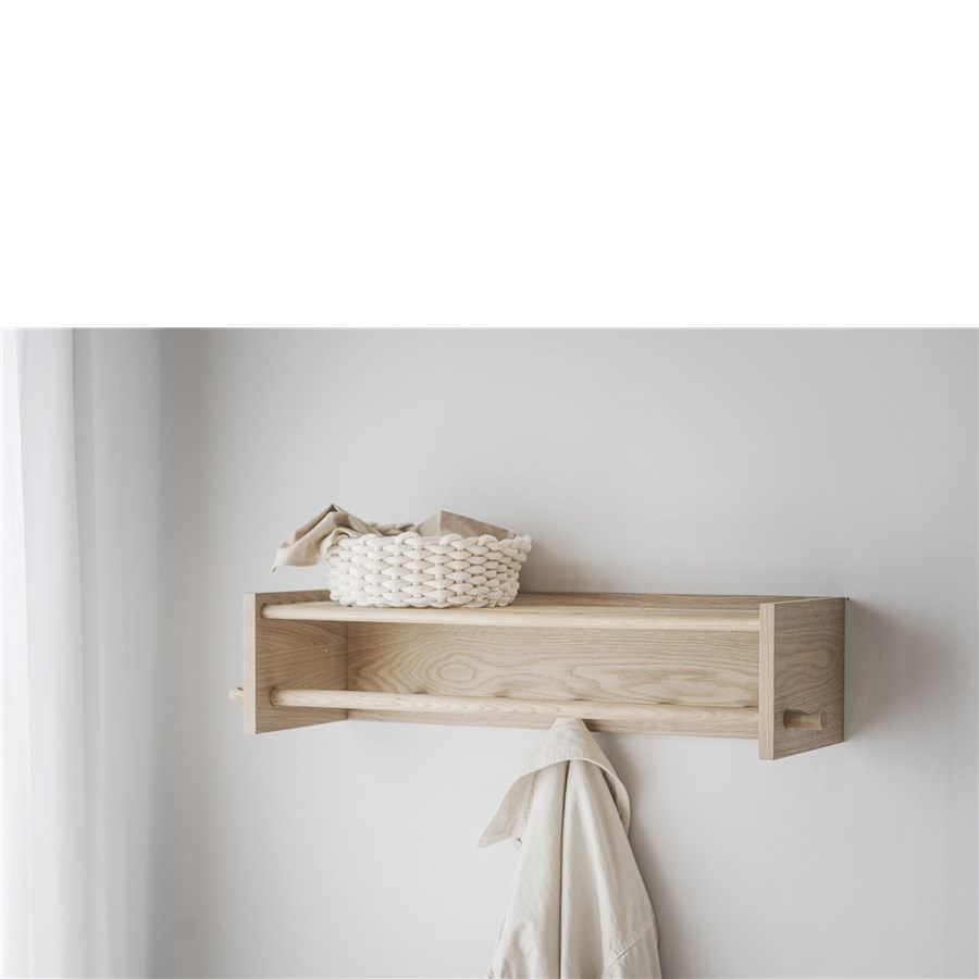 Hillmond hatthylla i vitpigmenterad ek har fem krokar plus två extra på sidorna samt klädstång. Finns i ek och vitpigmenterad ek.