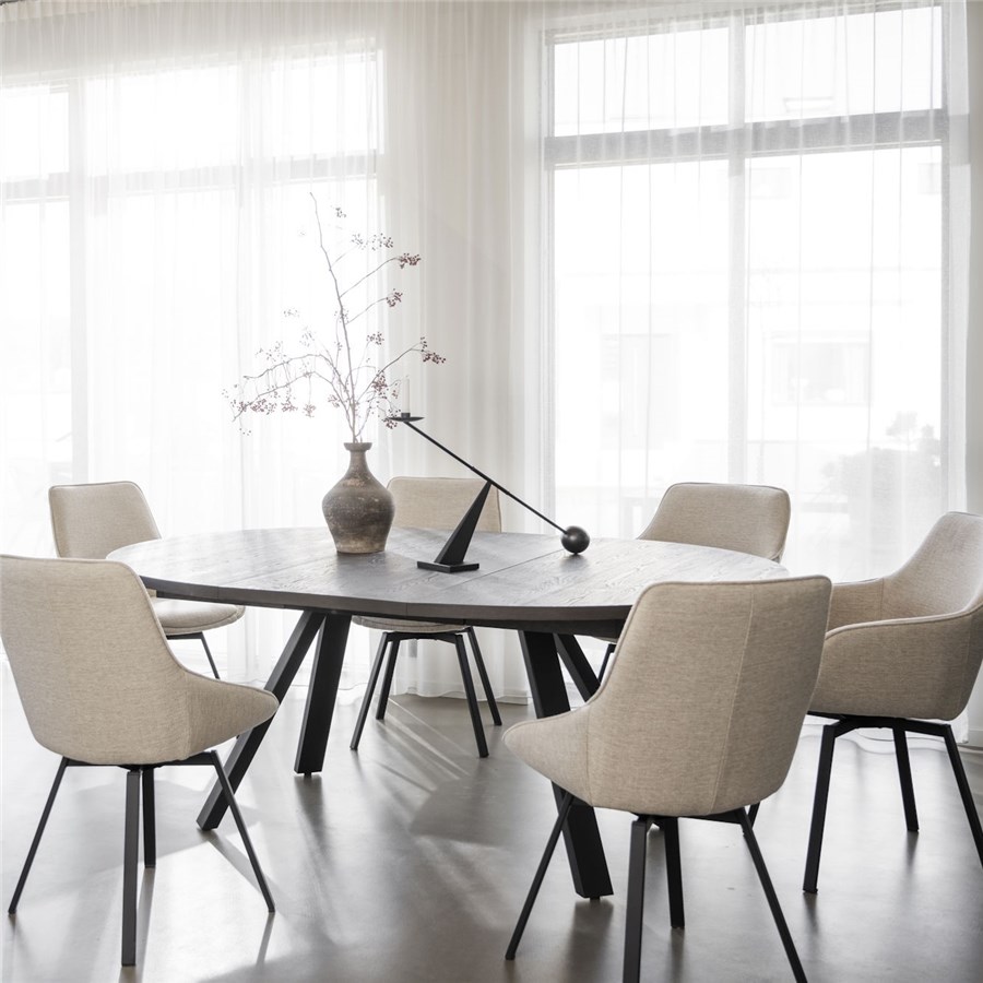 Maddock är ett praktiskt och förlängningsbart runt matbord med bordsskiva i brunoljad ek och svarta pulverlackerade metallben. Köp till en eller två tilläggsskivor för att förlänga bordet till 235 cm.