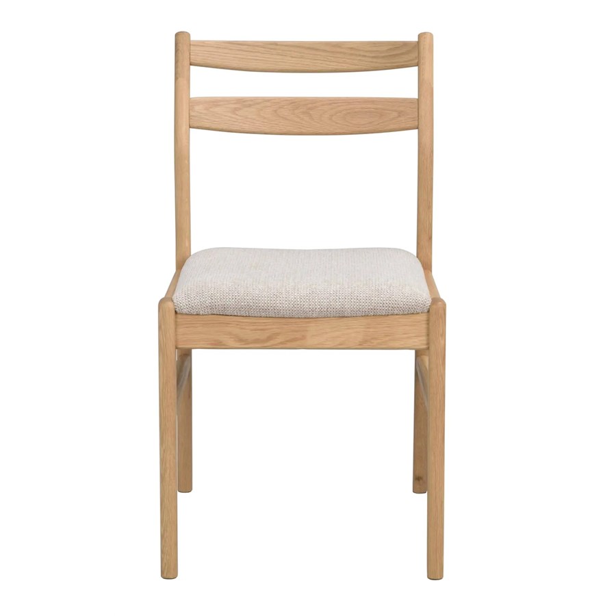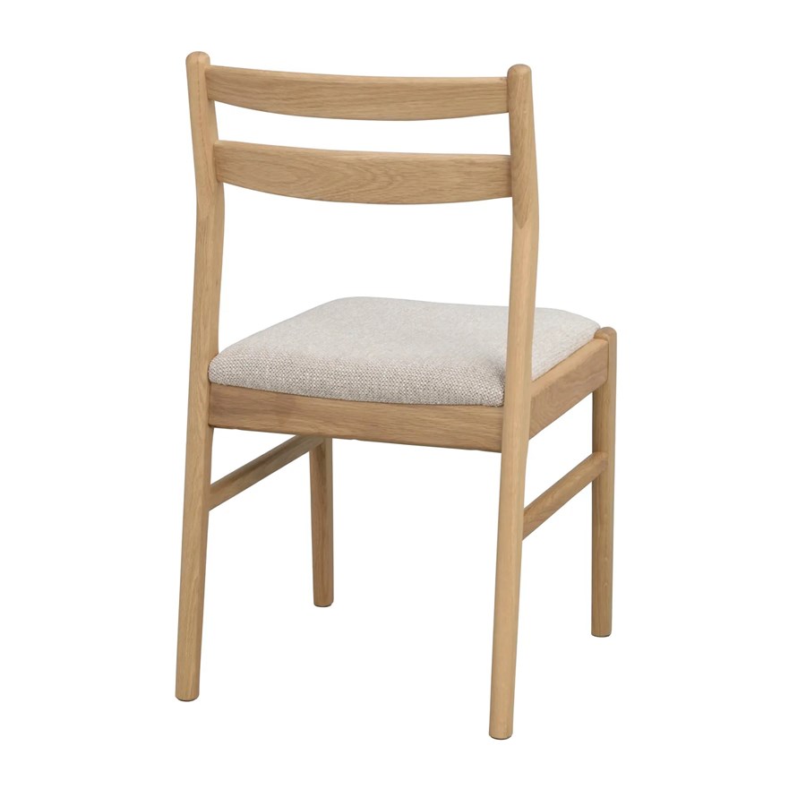Kerwin stol i massiv ek och med tygklädd sits har både rundade och raka former.
