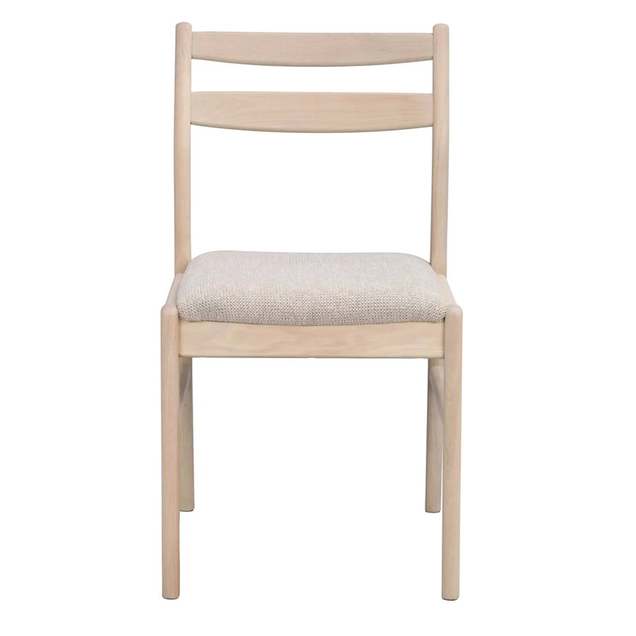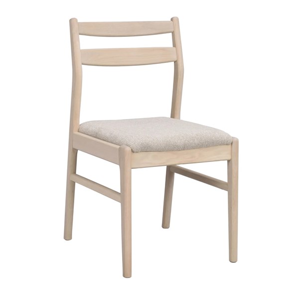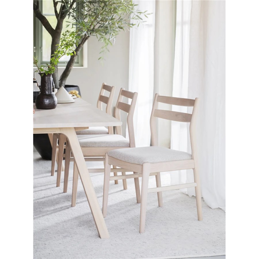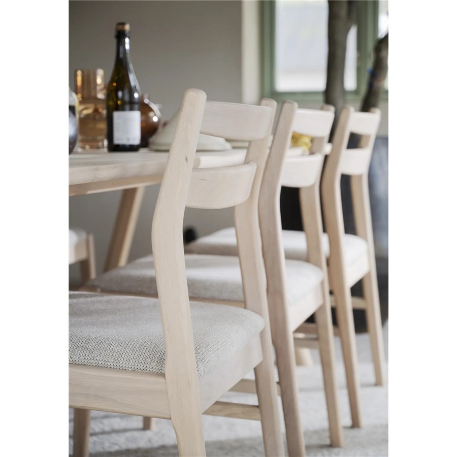 Kerwin stol i massiv vitpigmenterad ek och med tygklädd sits har både rundade och raka former.