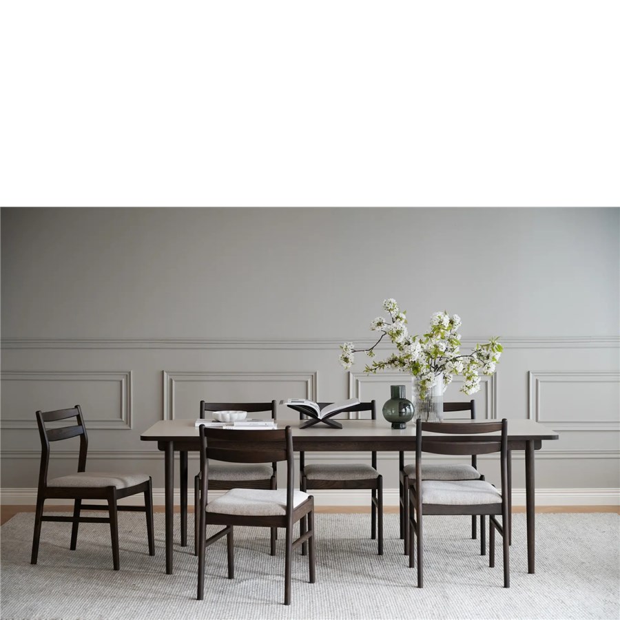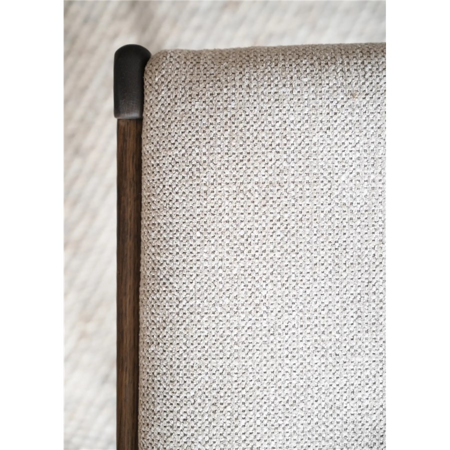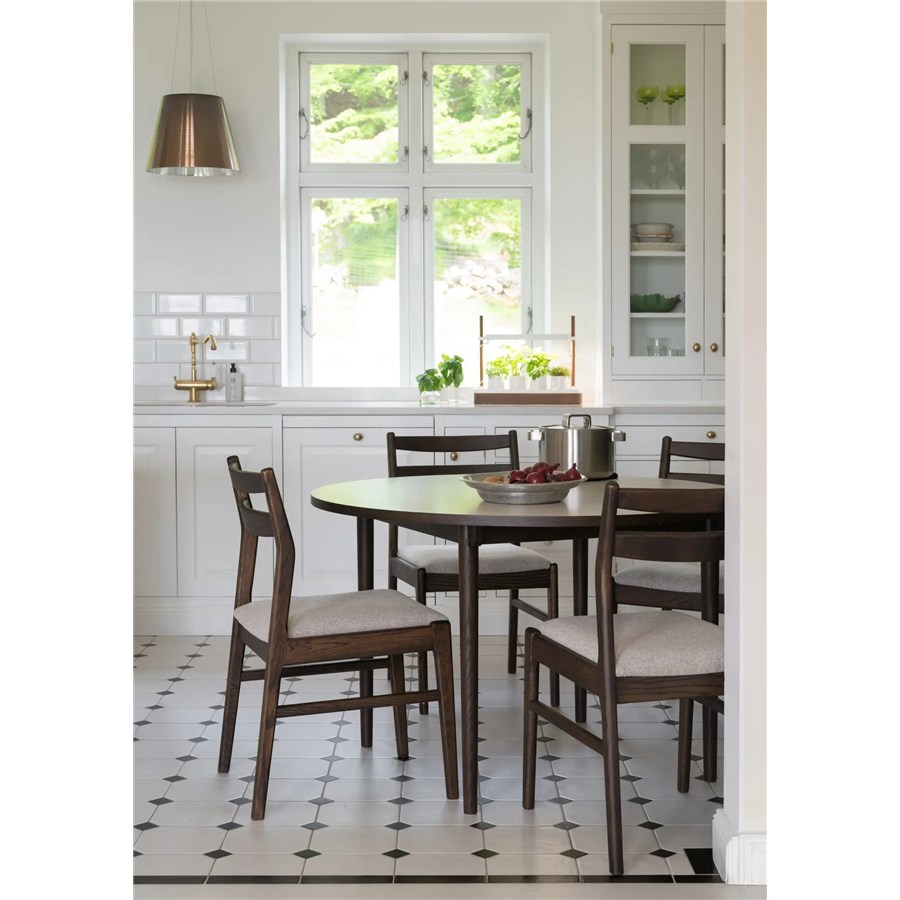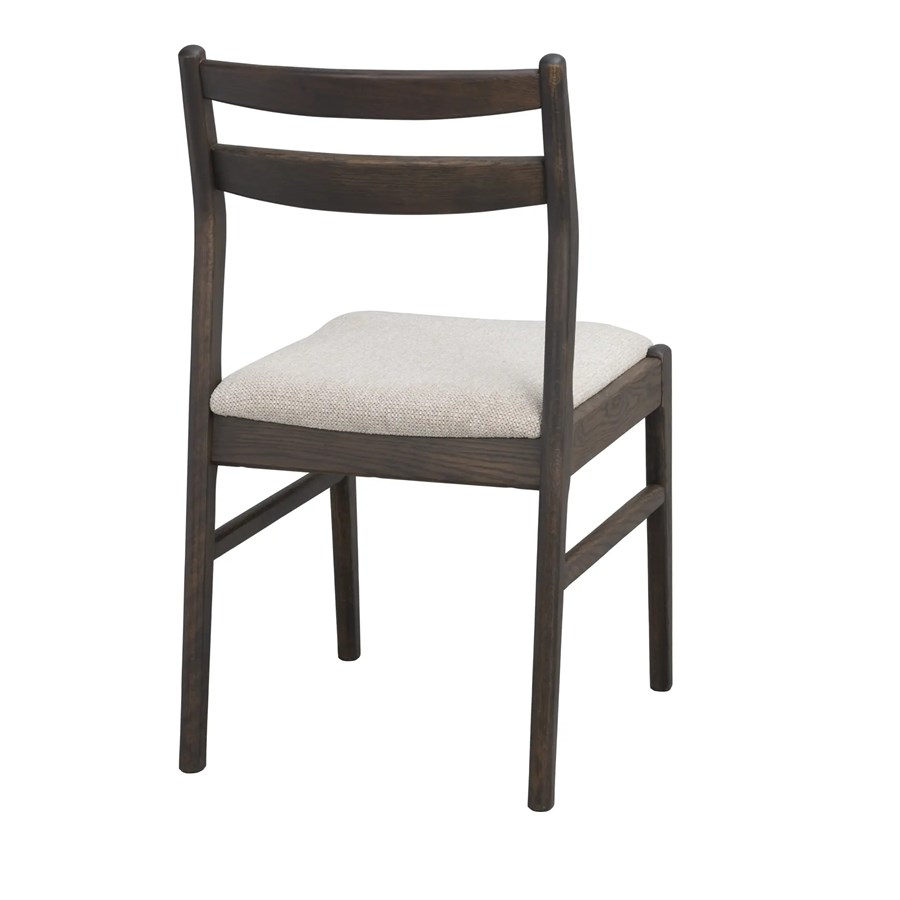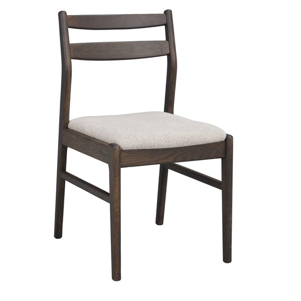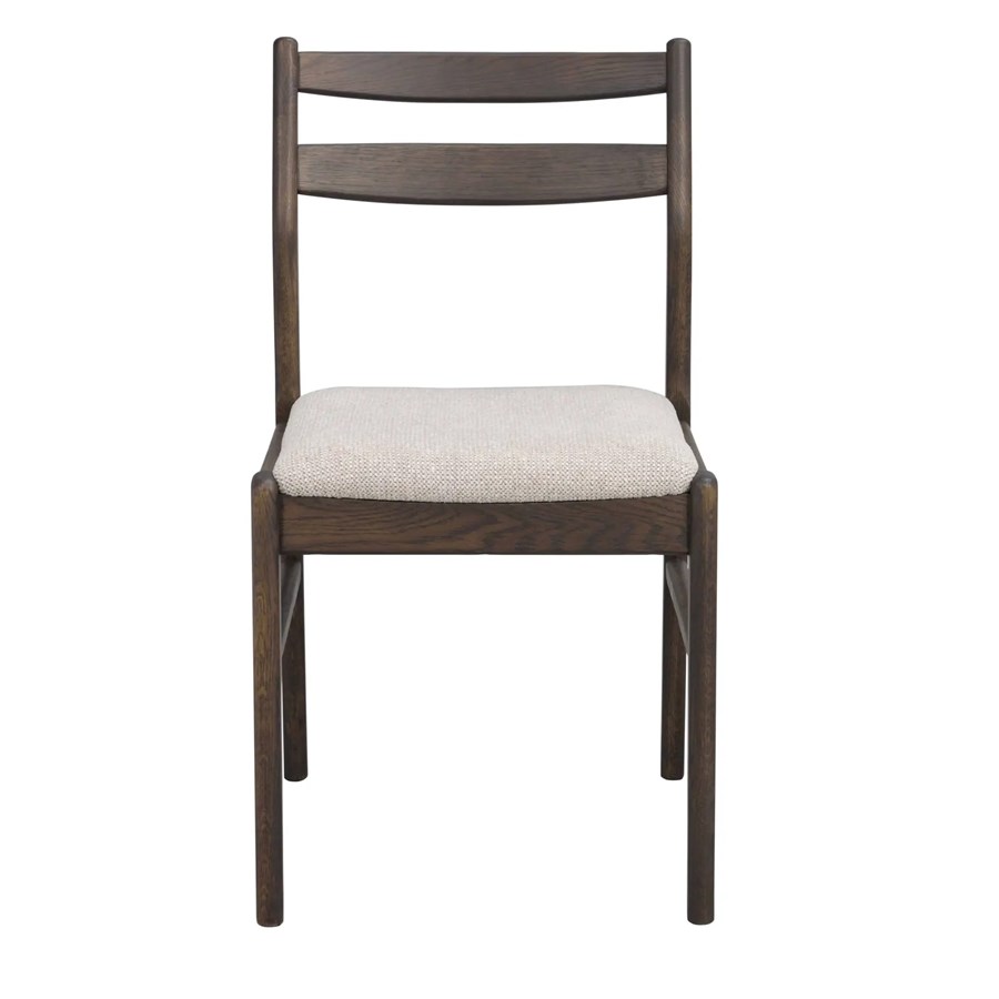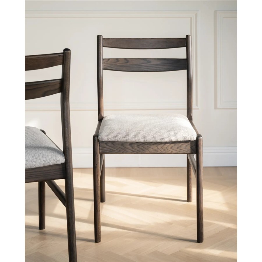 Kerwin stol i massiv brun ek och med tygklädd sits har både rundade och raka former.