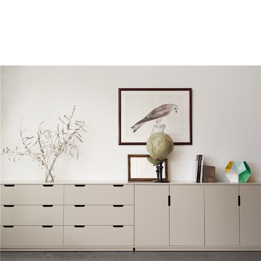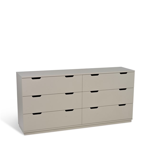 Byrå Aoko med urfrästa handtag. Finns i beige lack och vitlack.
