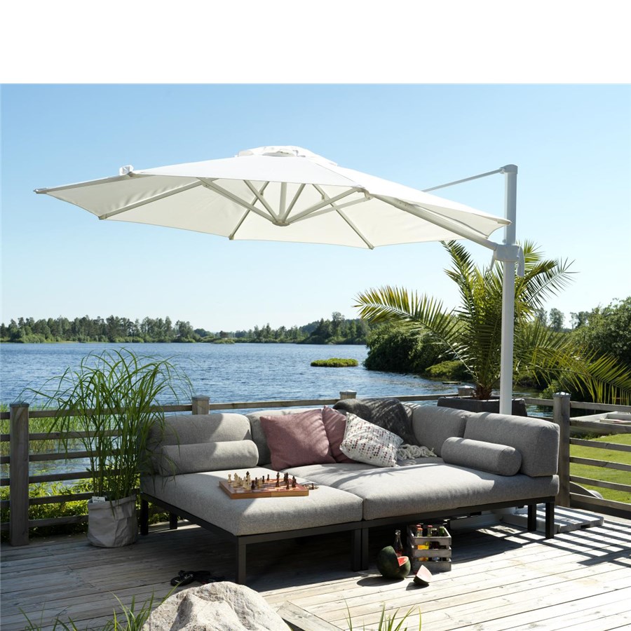 Linz är ett frihängande parasoll i aluminium med tiltfunktion. Finns i flera olika storlekar. Fotkors ingår men inte vikter.