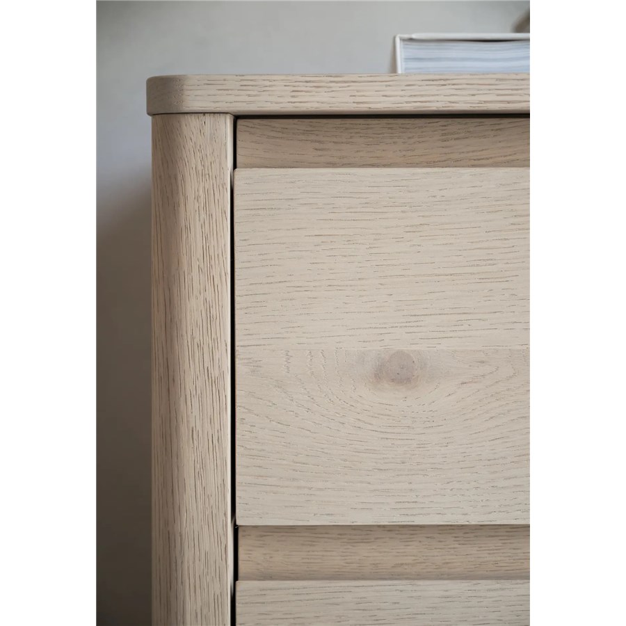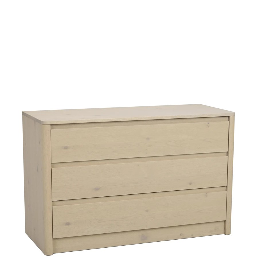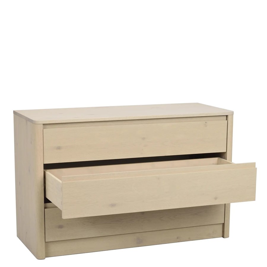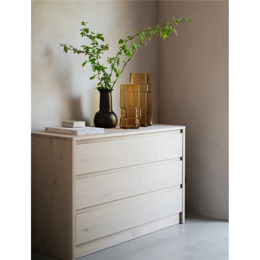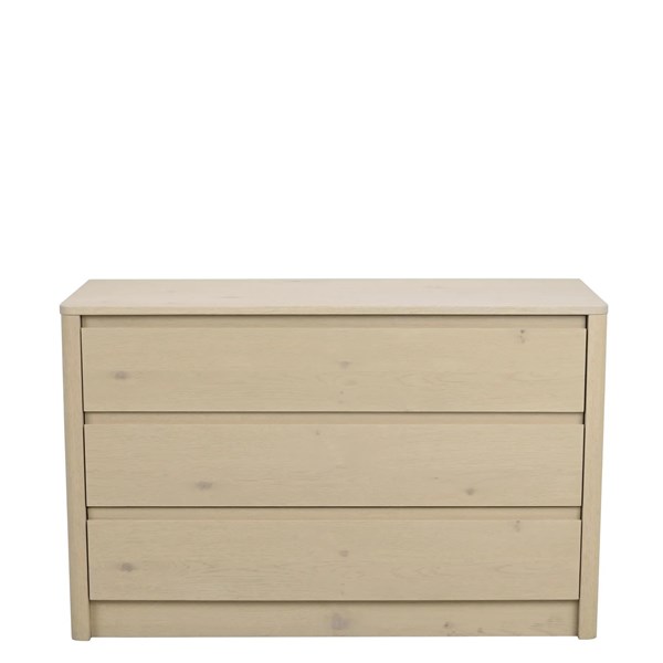 Melstone byrå i vitpigmenterad vildek med infrästa handtag i massivt trä. Alla lådor är utrustade med mjukstängande funktion