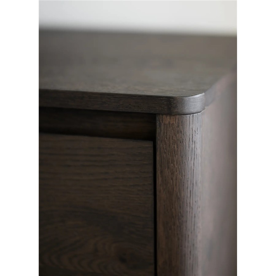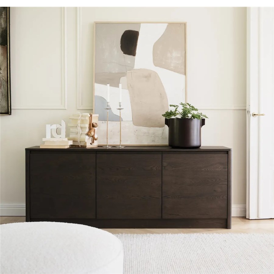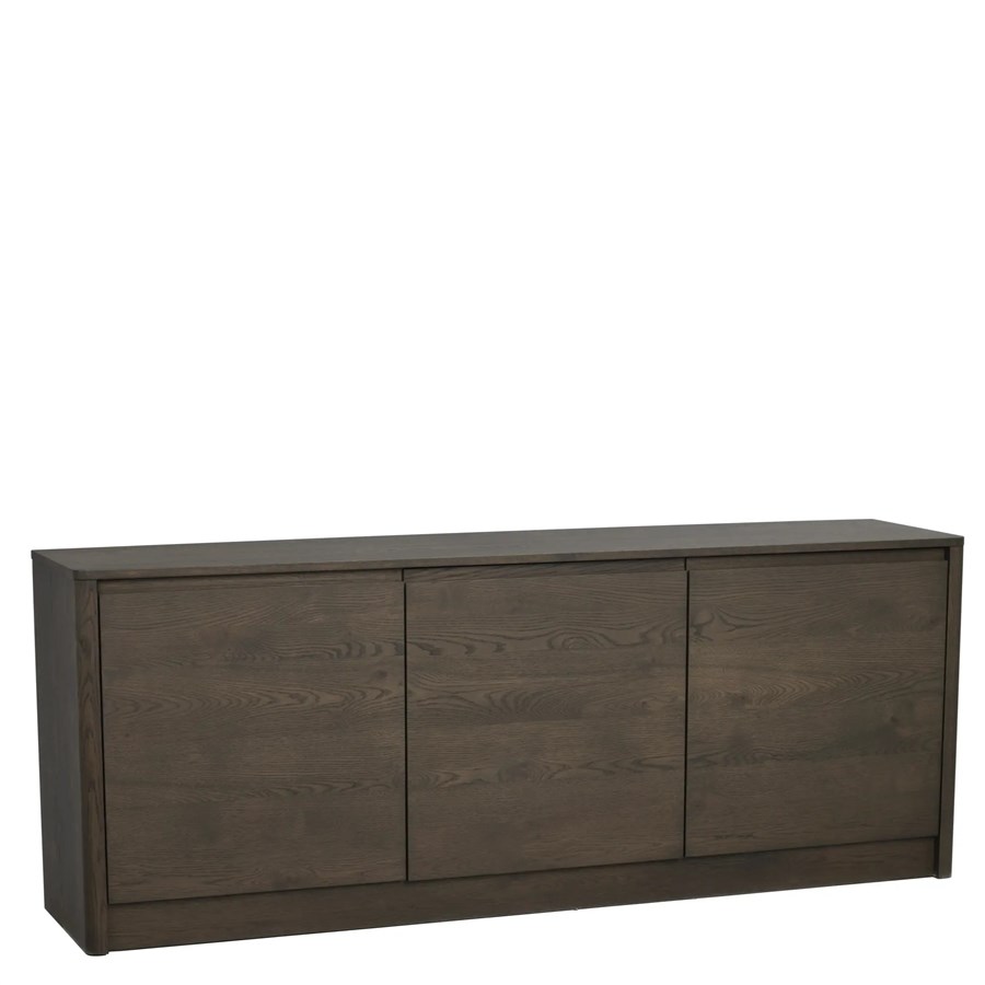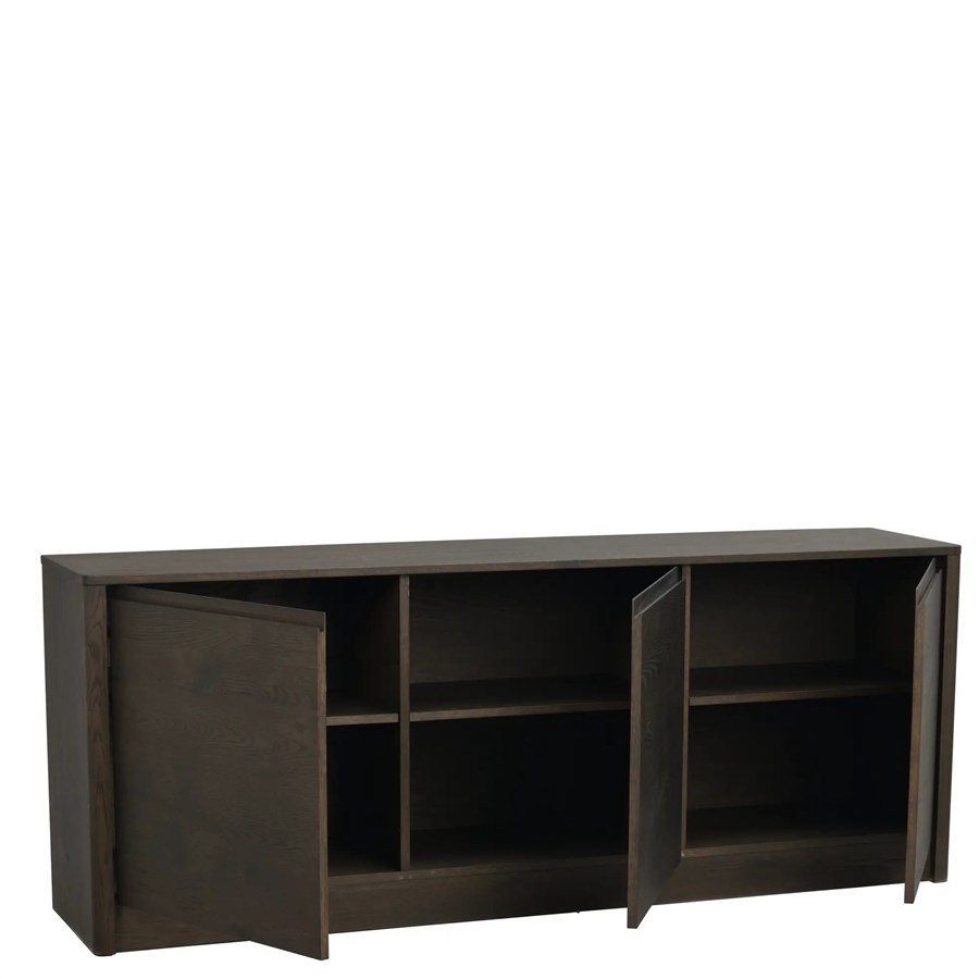 Melstone sideboard i brunoljad vildek med infrästa handtag i massivt trä. Alla dörrar är utrustade med mjukstängande funktion.