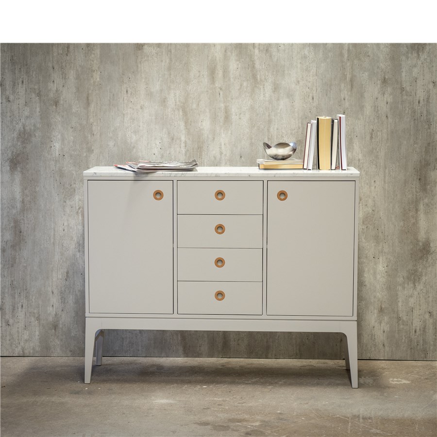 Höllviken skänk med två skåp och fyra lådor. Finns i vitpigmenterad ek eller ljus grålack. Köp till kalkstenstopp till din skänk.
