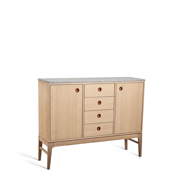 Höllviken skänk med två skåp och fyra lådor. Finns i vitpigmenterad ek eller ljus grålack. Köp till kalkstenstopp till din skänk.