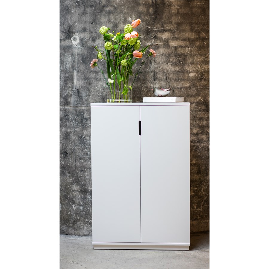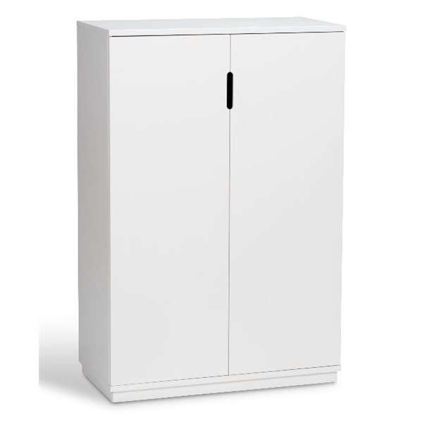 Skåp Aoko med täckta dörrar och urfrästa handtag. Finns i vitlack och beige lack.