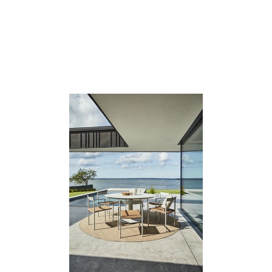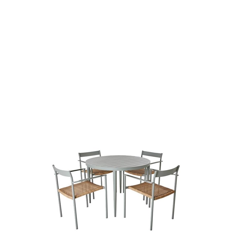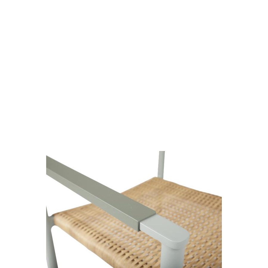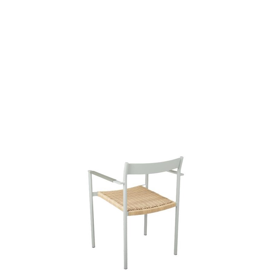 Stapelbar stol i aluminium med en flätad sits i konstrotting samt med kontrastfärg på armstödet. Finns i flera färger.