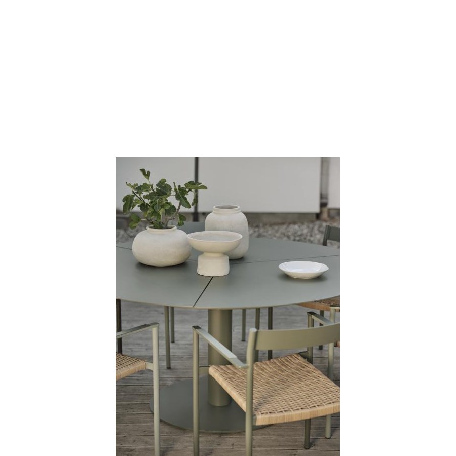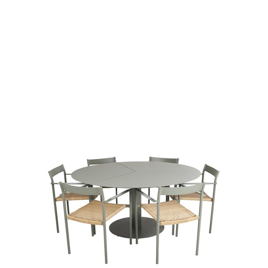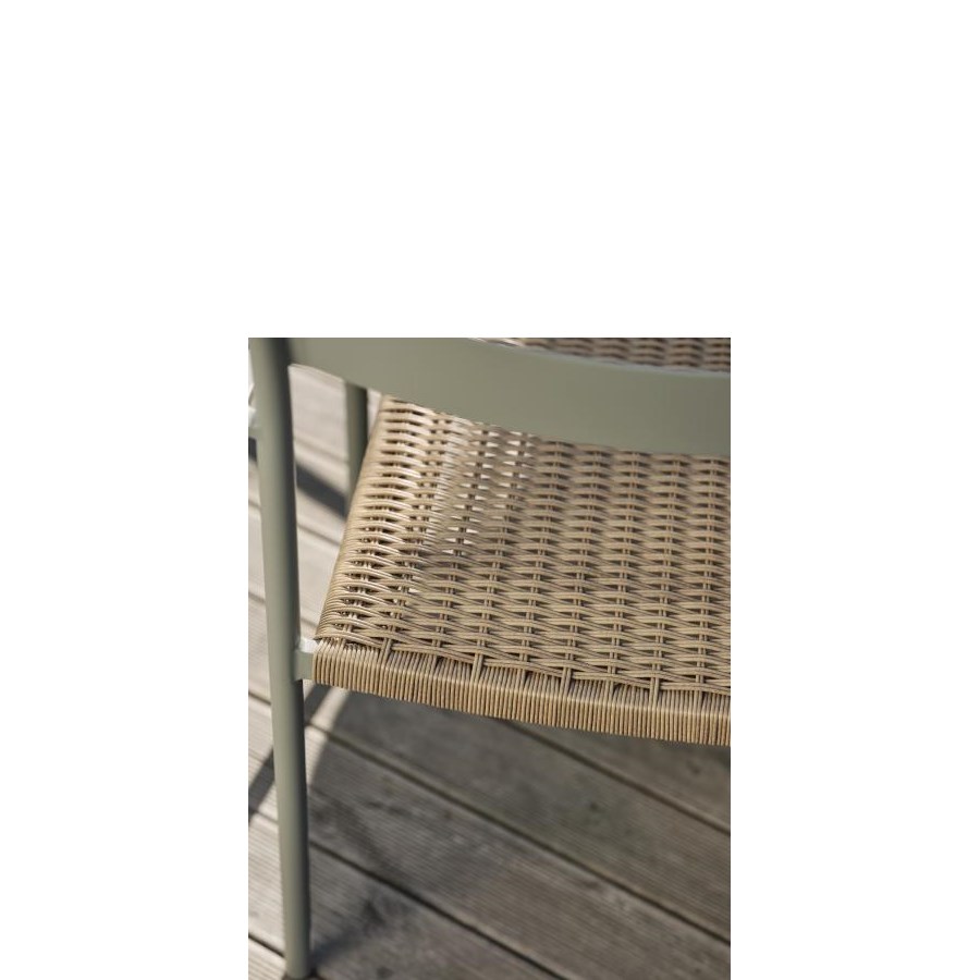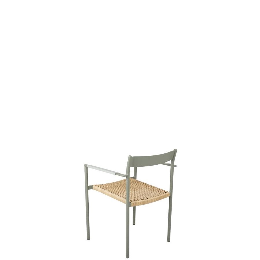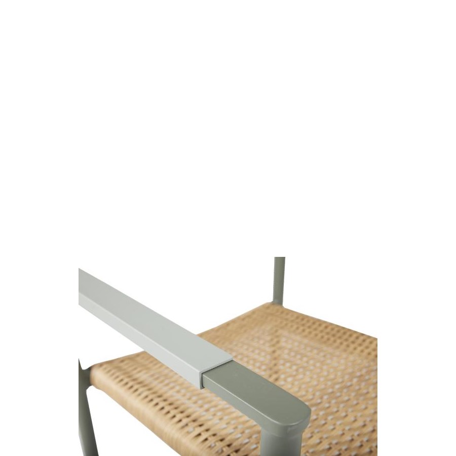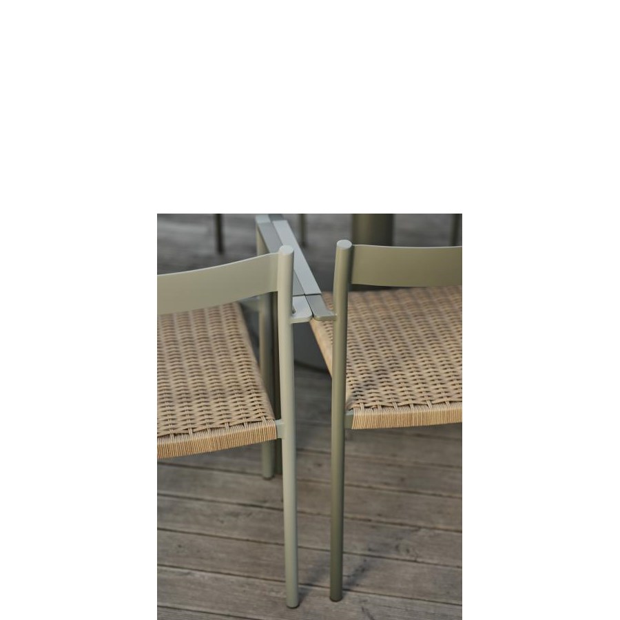 Stapelbar stol i aluminium med en flätad sits i konstrotting samt med kontrastfärg på armstödet. Finns i flera färger.