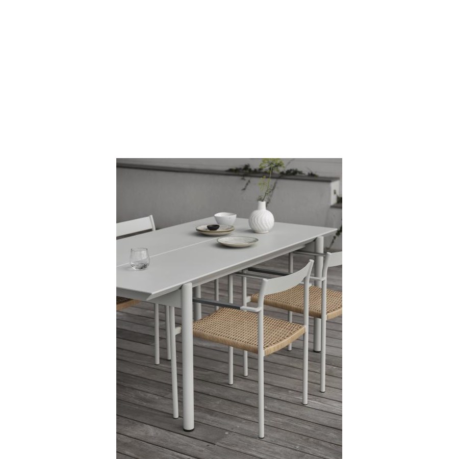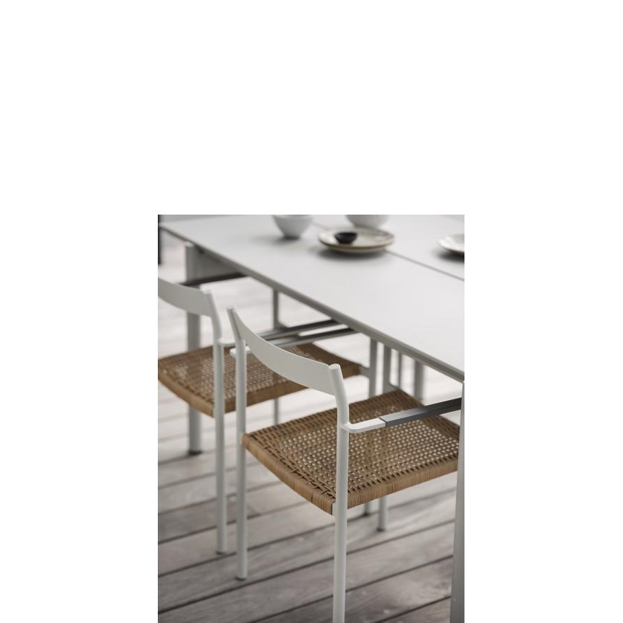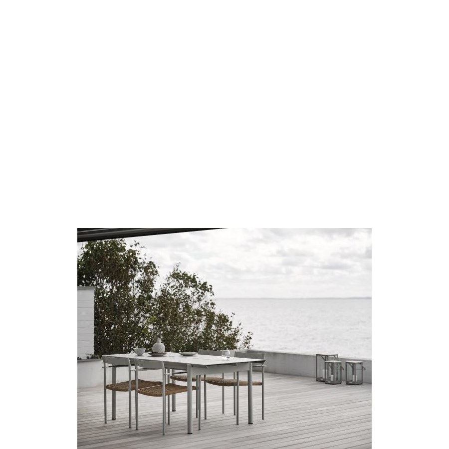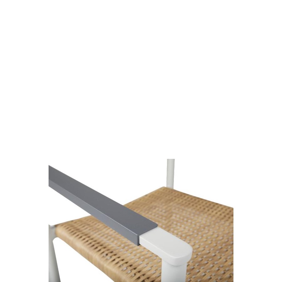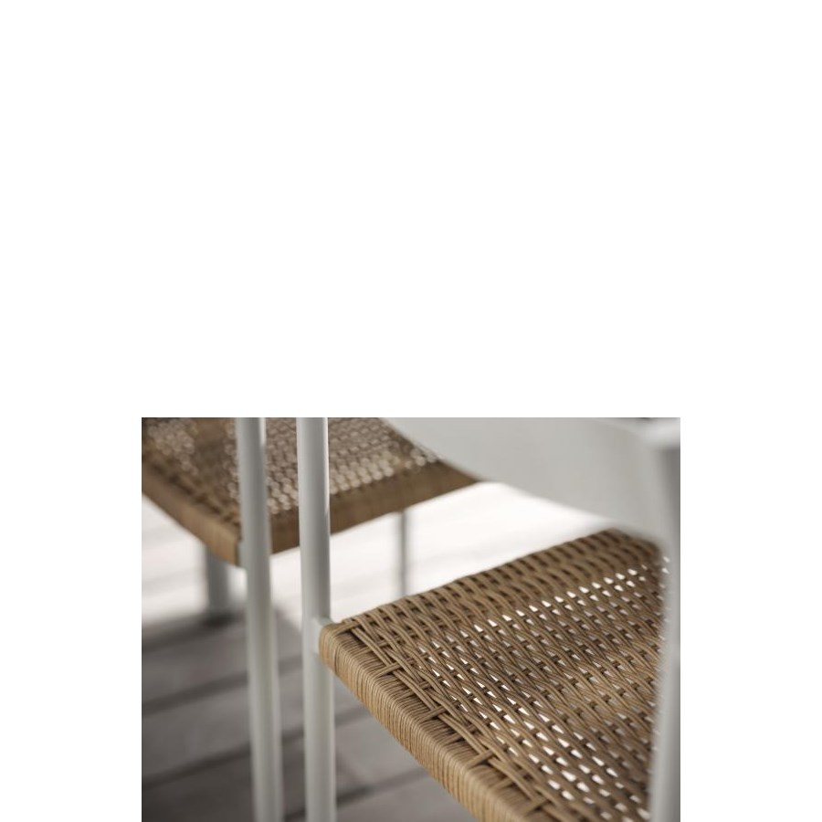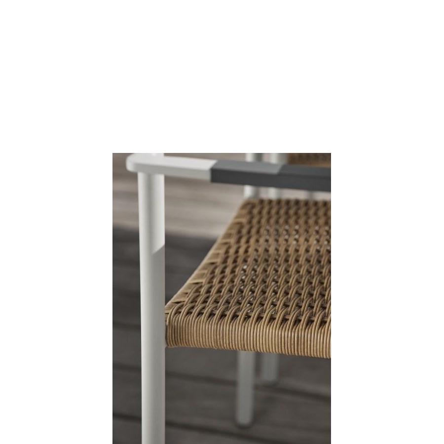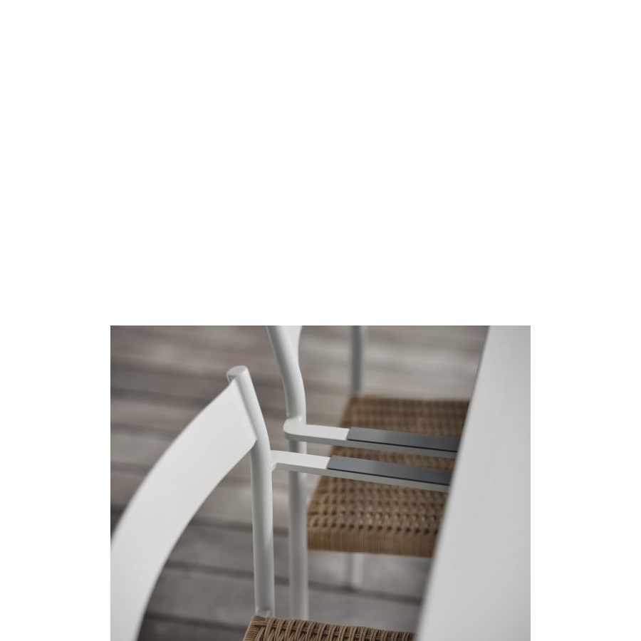 Stapelbar stol i aluminium med en flätad sits i konstrotting samt med kontrastfärg på armstödet. Finns i flera färger.