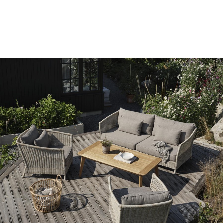Aster 3-sitssoffa i handvävd konstrotting och dynor i en beige nyans.