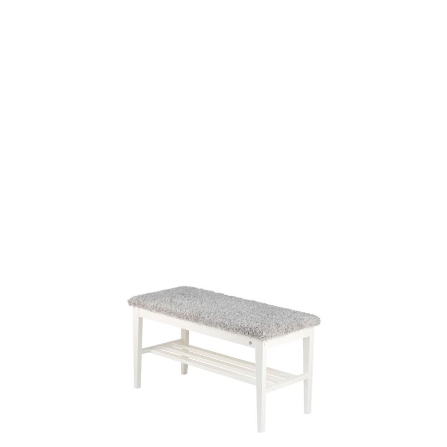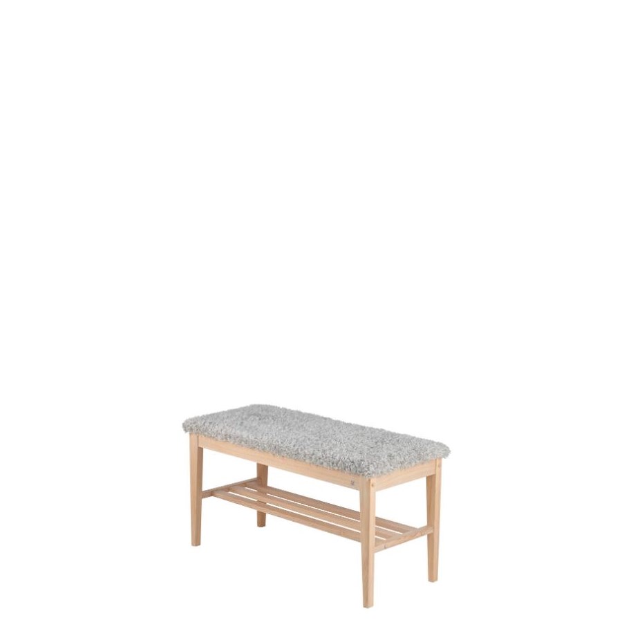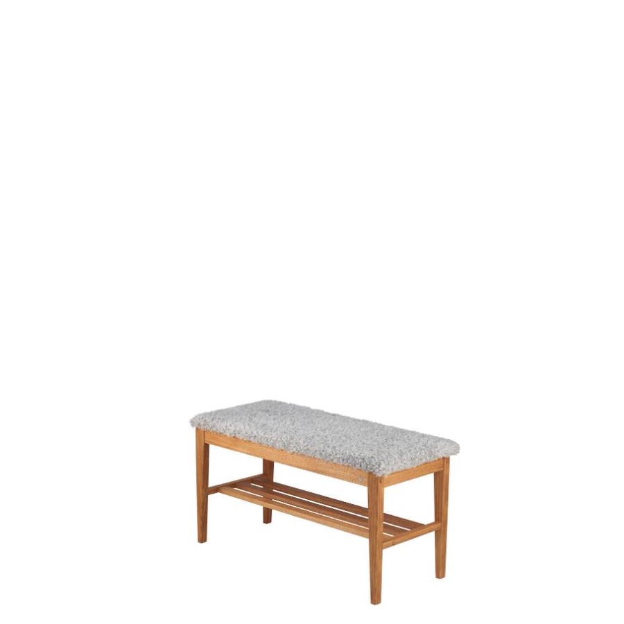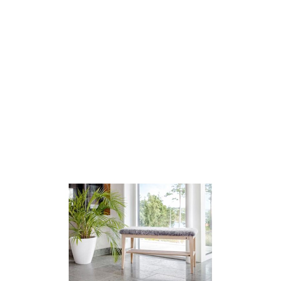 Nadja bänk finns i fem nyanser av massiv ek samt i vitlackad björk. Välj till fyra olika nyanser av fårskinn eller i grå fårskinnslook