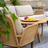 Lily är en generös loungeserie med extra djup sits och fylliga dynor för avslappnad lyx. En ram av twistad konstrotting och ben i teak.