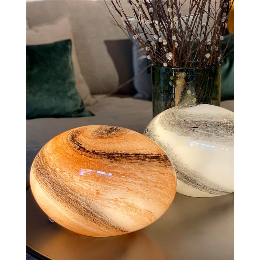Mira bordslampa helt i glas finns i två olika färger: vitsvart och naturfärgad. Den är munblåst vilket gör att varje lampa är unik.