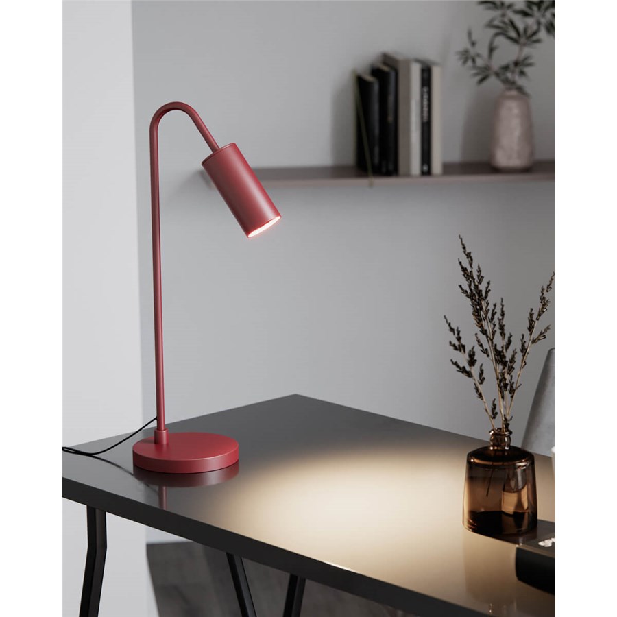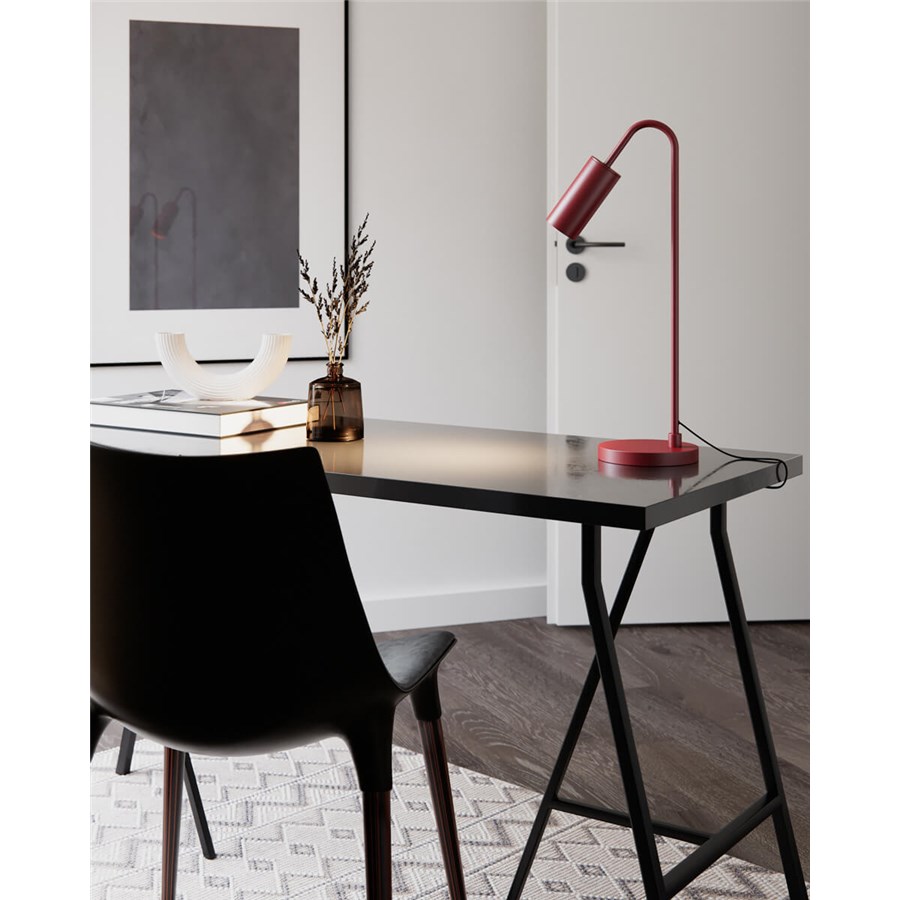 Curve bordslampa är rak och kurvig på samma gång. Tillverkad i matt metall och finns i färgerna röd, svart och guld.