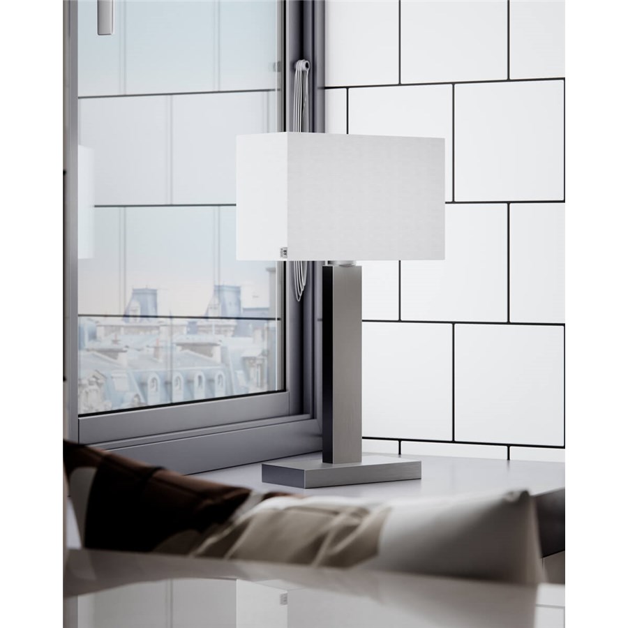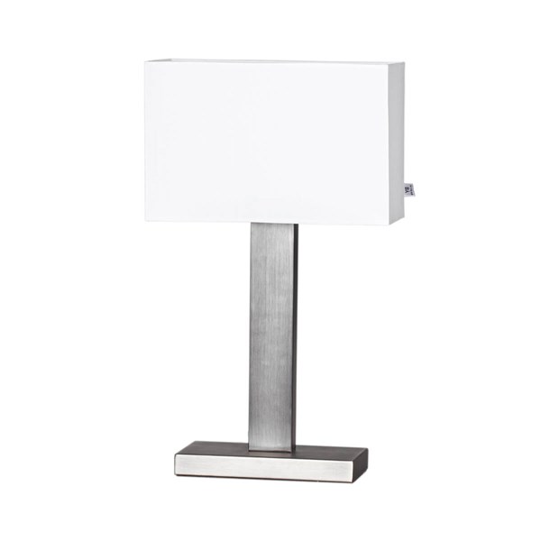 Bordslampan Prime i metall med tygskärm finns i två höjder och i tre olika färgalternativ: matt mässing med svart skärm, krom med svart skärm och satin med vit skärm.