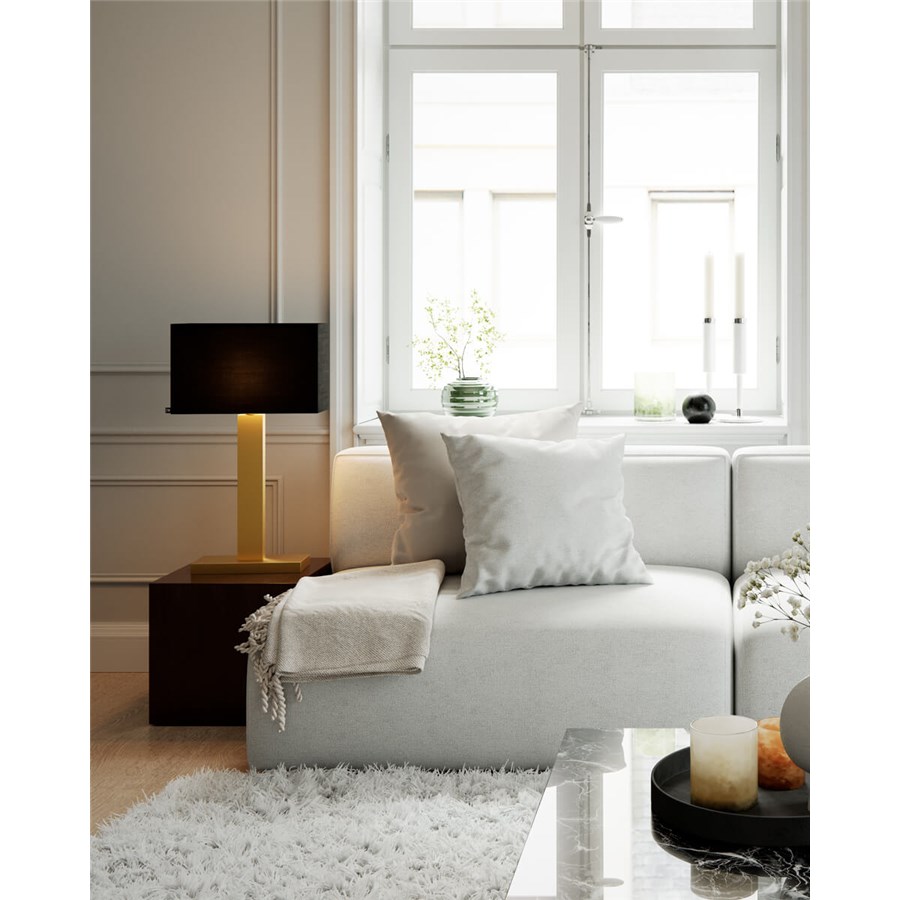 Bordslampan Prime i metall med tygskärm finns i två höjder och i tre olika färgalternativ: matt mässing med svart skärm, krom med svart skärm och satin med vit skärm.