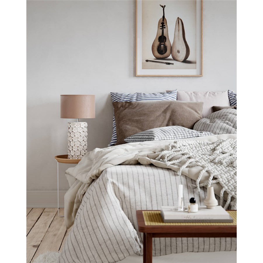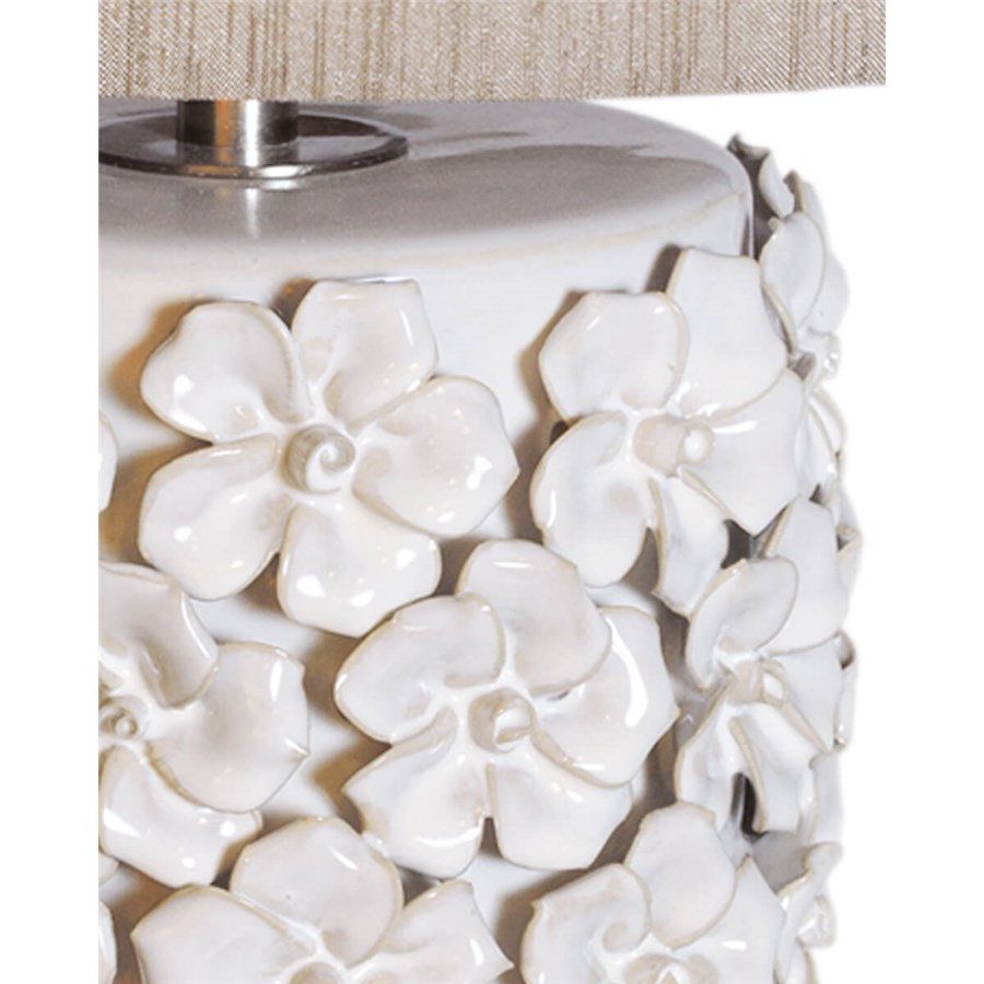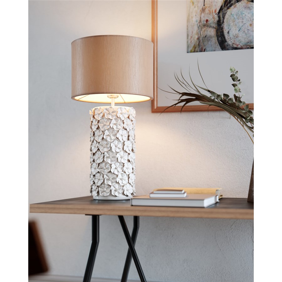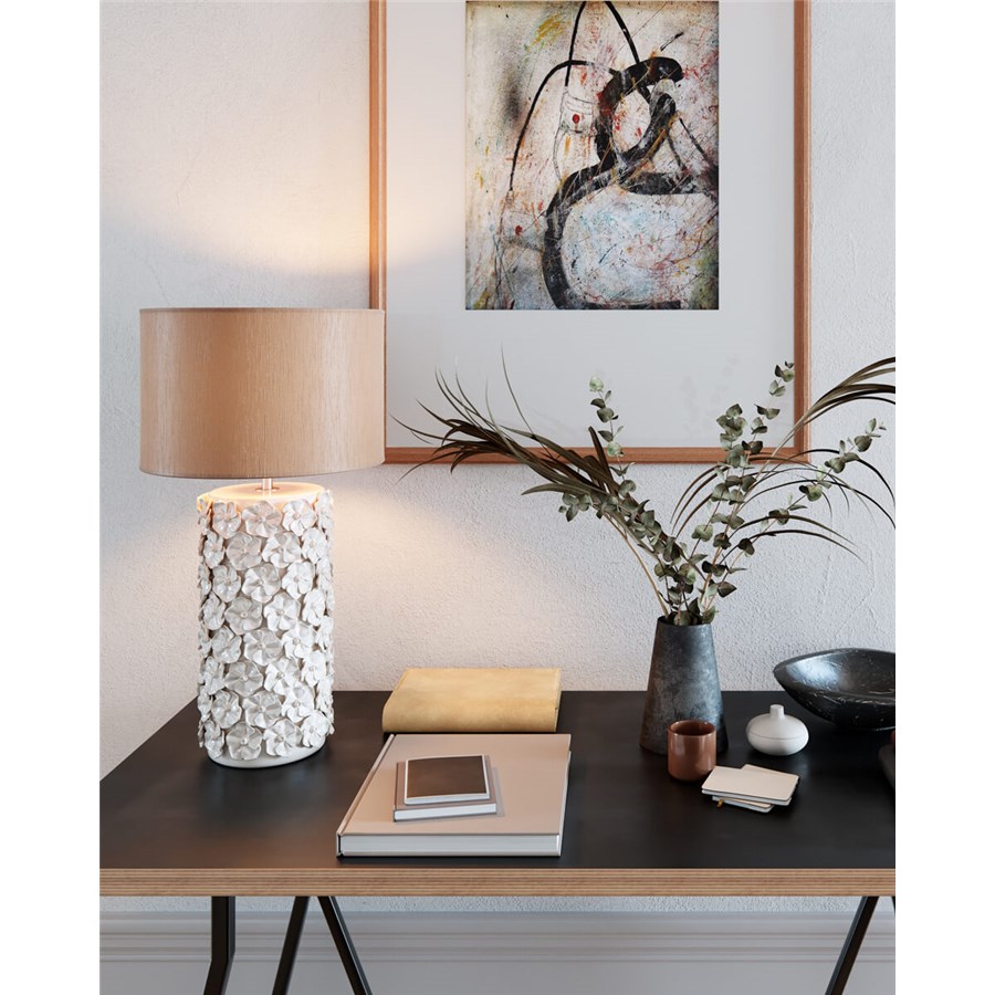 Bordslampan Fiore har en lampfot i keramik utsmyckad med vackra rosor. Den medföljande bruna skärmen i thai silke ger ett varmt och behagligt ljus.