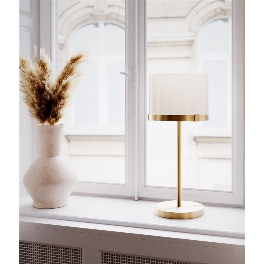 Bordslampa Marcel i glansigt vitt glas med eleganta mässingsdetaljer.