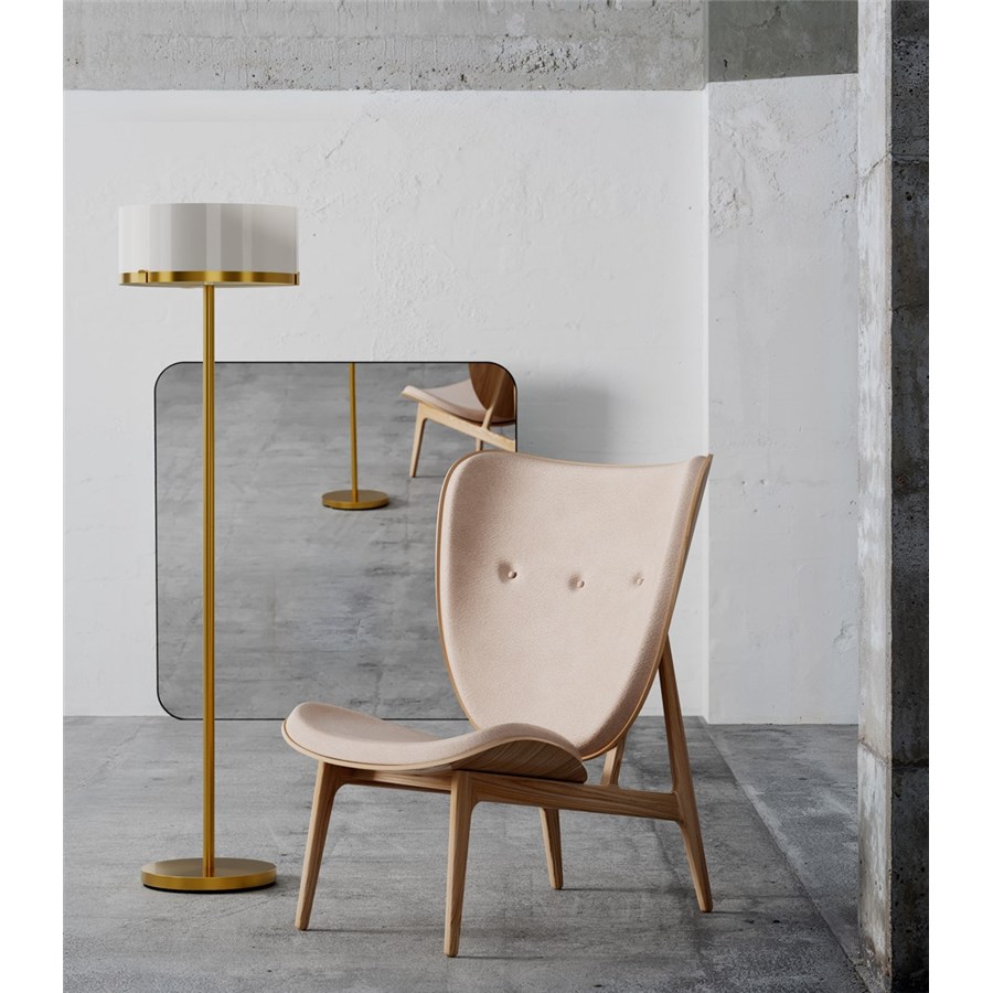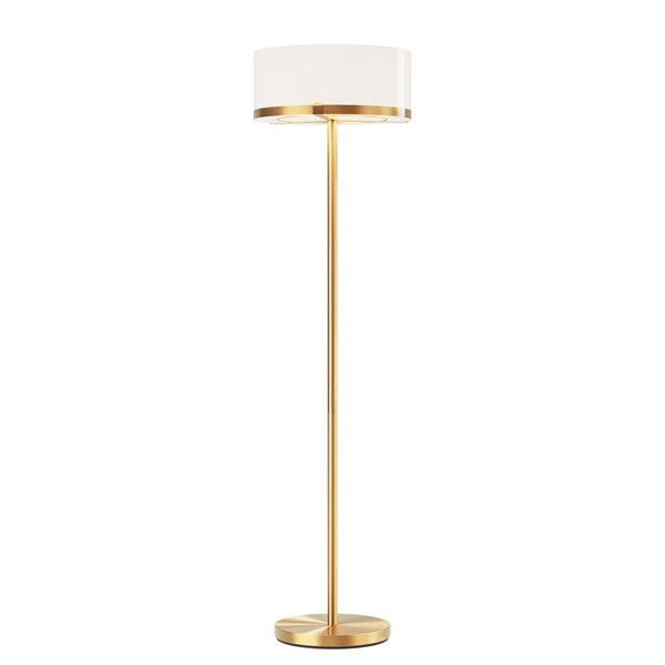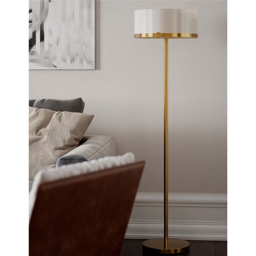 Golvlampa Marcel i glansigt vitt glas med eleganta mässingsdetaljer.