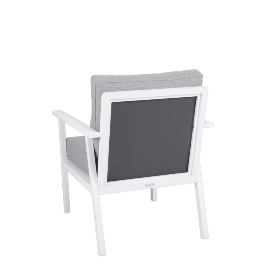 Samvaro fåtölj i aluminium med bekväma dynor i olefintyg med vattenavvisande beläggning. Fåtöljen finns i två olika storlekar.