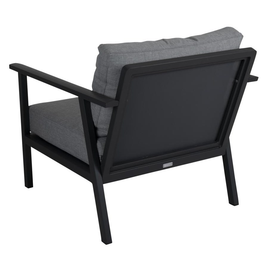 Samvaro fåtölj i aluminium med bekväma dynor i olefintyg med vattenavvisande beläggning. Fåtöljen finns i två olika storlekar.