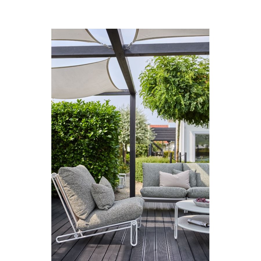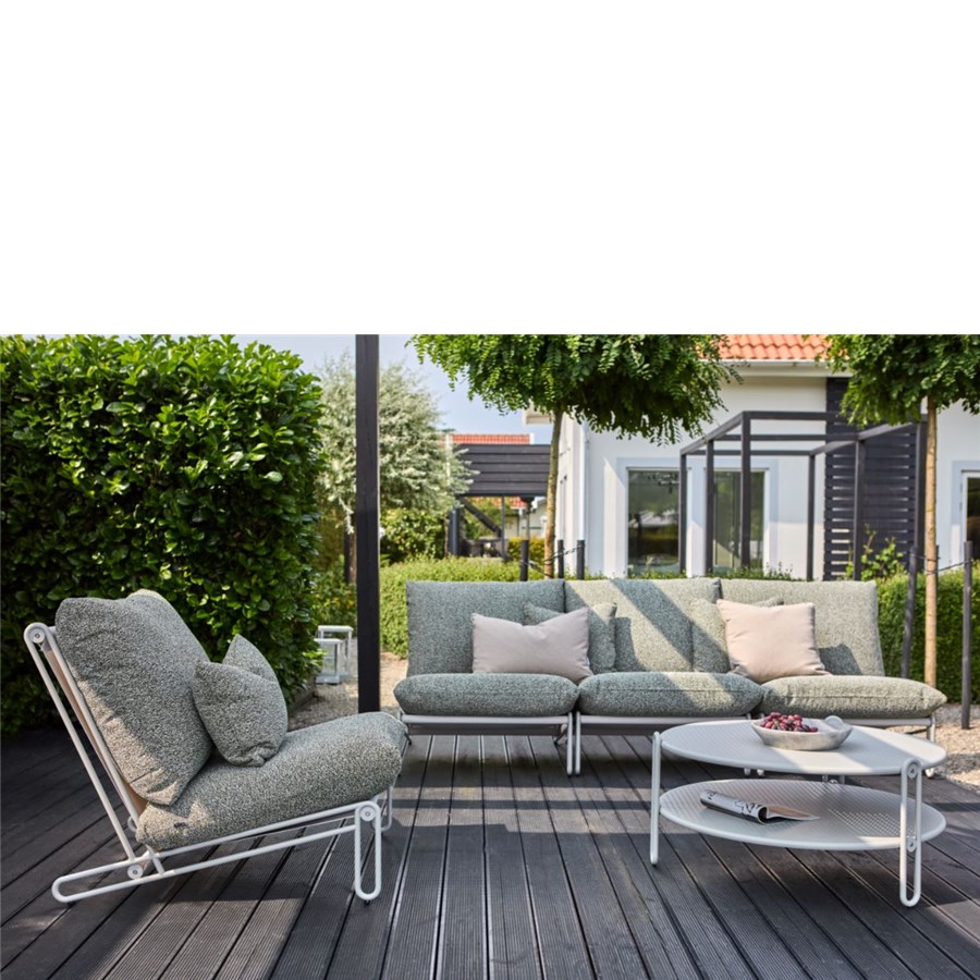 Blixt fåtölj är en modern byggbar soffa/stol i loungestil med aluminiumstomme i ljusgrått och sits i olefintyg. Dynorna finns i tre olika färger.