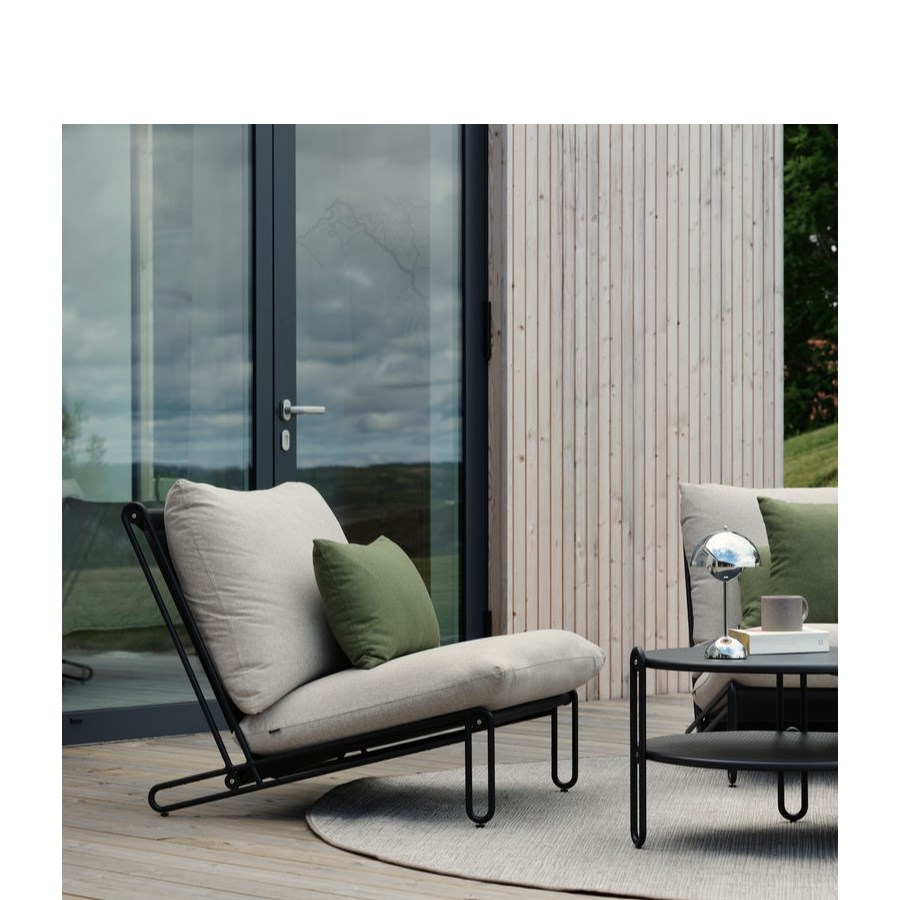 Blixt fåtölj är en modern byggbar soffa/stol i loungestil med aluminiumstomme i svart och sits i olefintyg. Dynorna finns i tre olika färger.