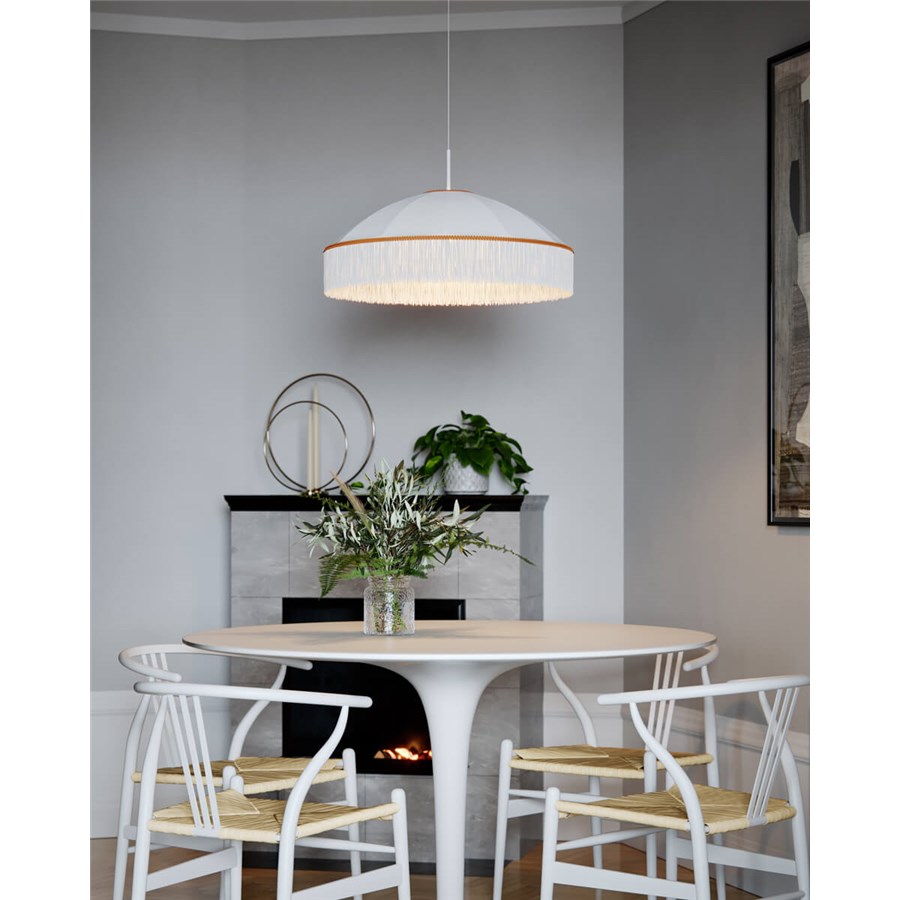 Taklampan Francis kombinerar elegans och modernitet. Skärmen som är gjord av siden är prydd med hängande fransar och en vacker guldkant.