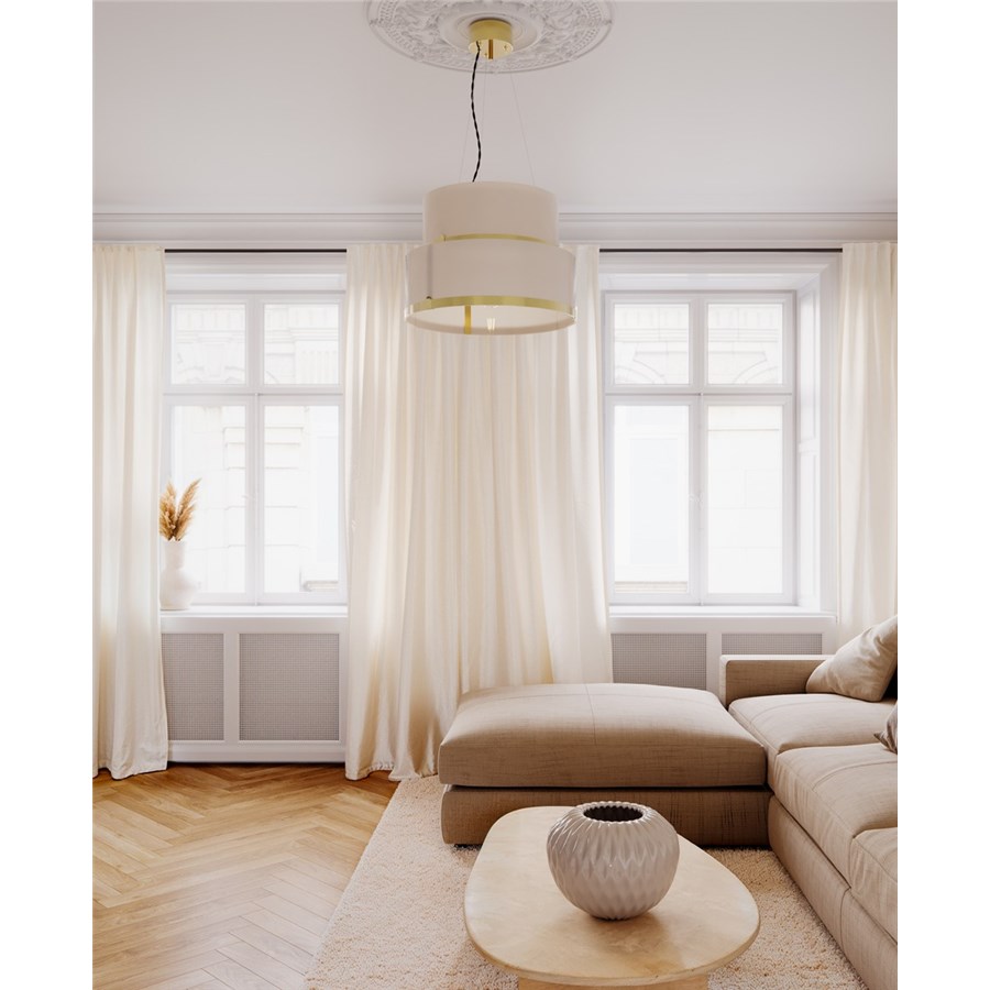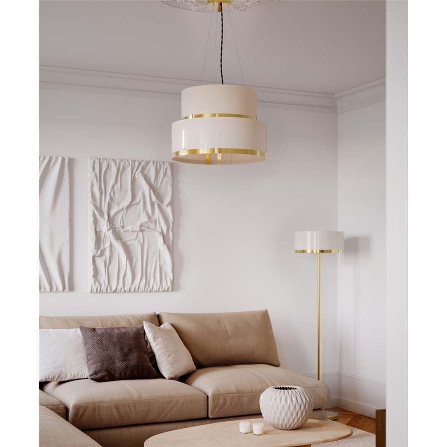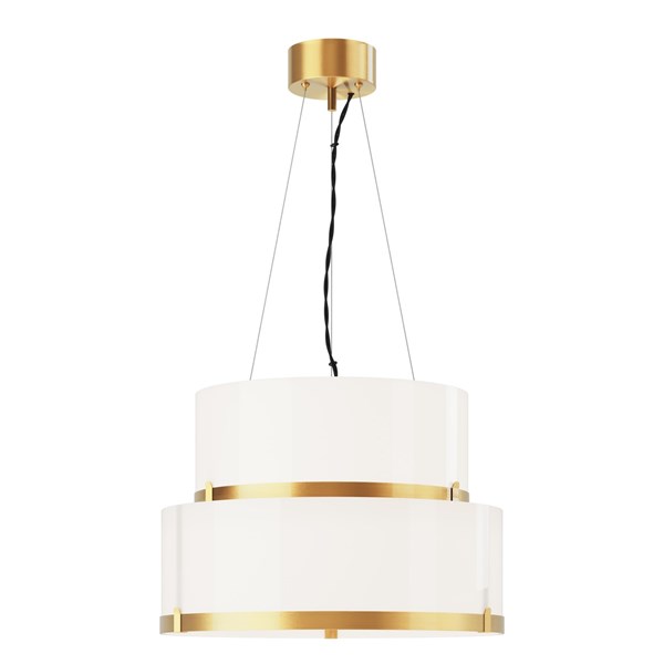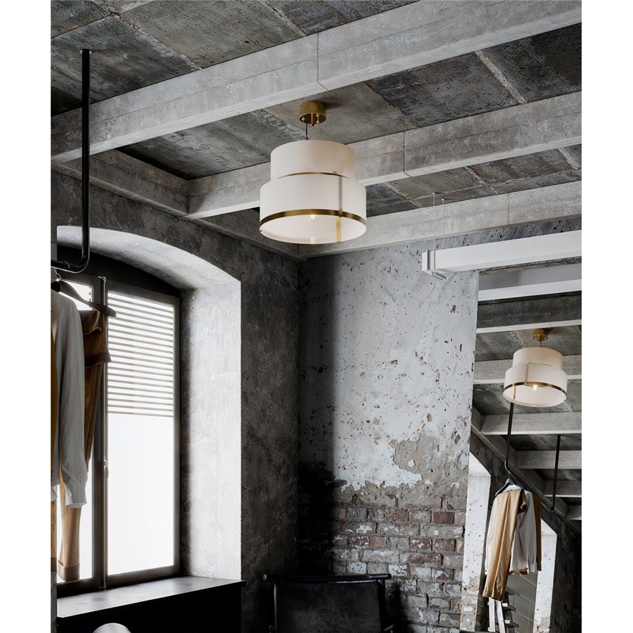 Taklampa Marcel i glansigt vitt glas med eleganta mässingsdetaljer.