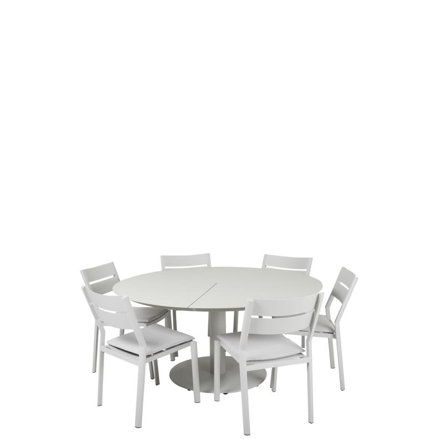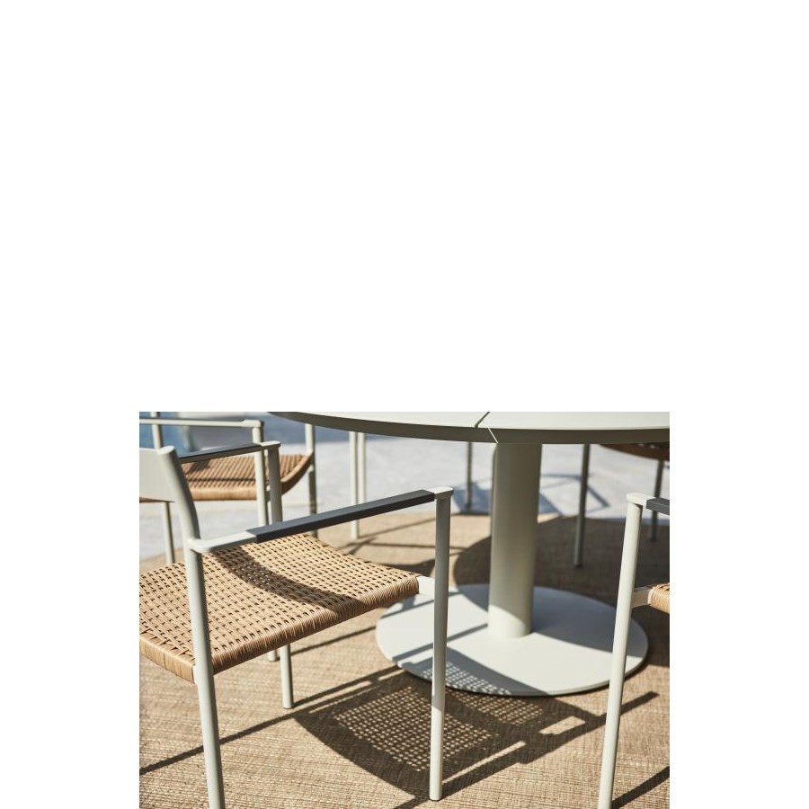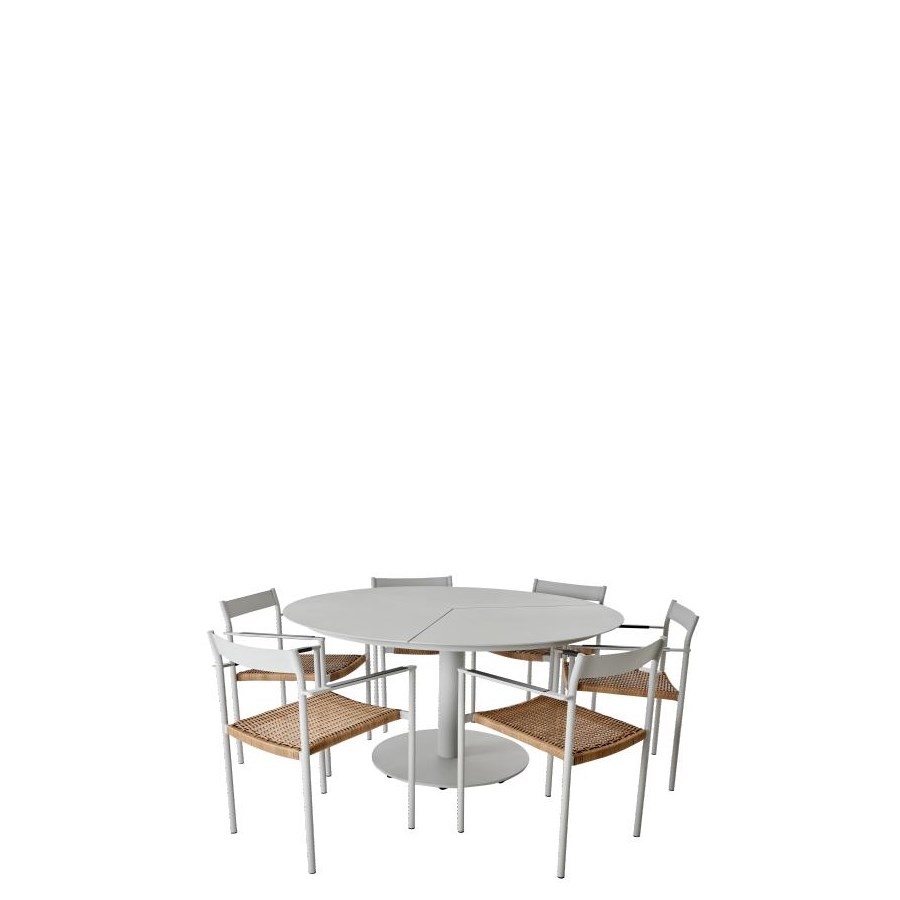 Stilfulla matbordet Peace i aluminium från Brafab. Hela 150 cm i diameter så att man får plats många runt middagsbordet. Pelaren i mitten gör att man också får plats med benen utan att behöva trängas. Bordet är även utrustat med justerbara fötter. Finns i tre färger.