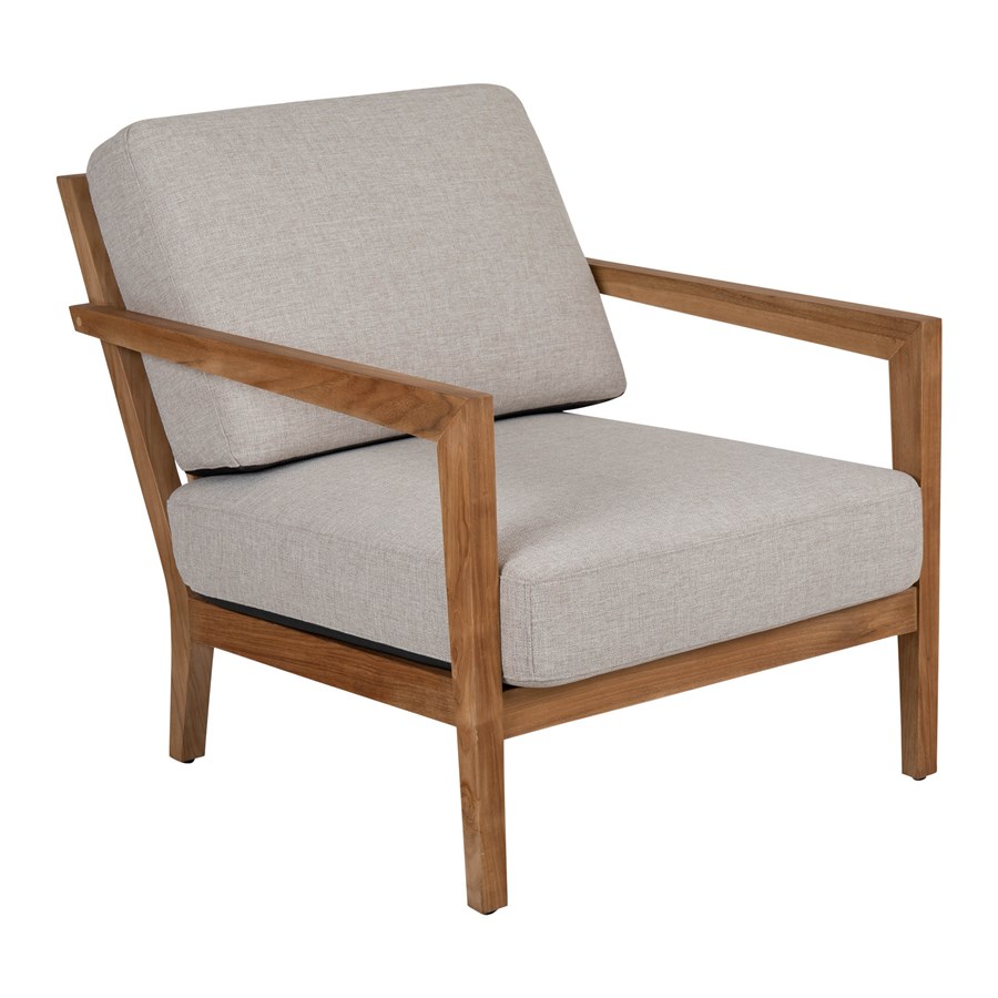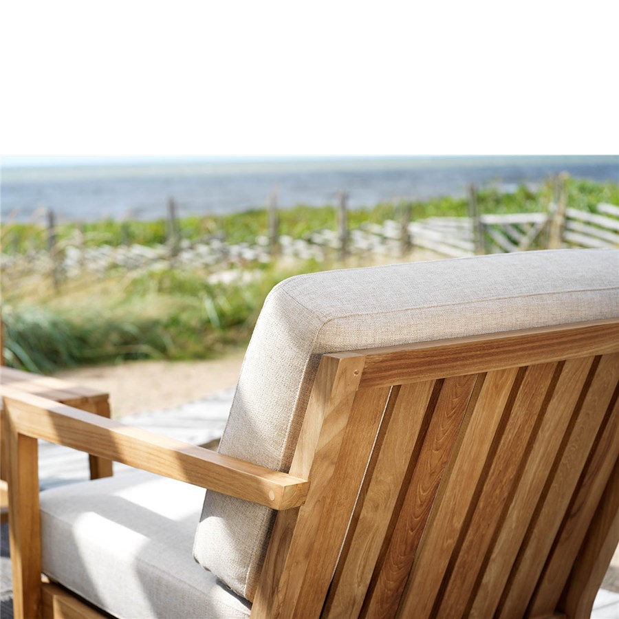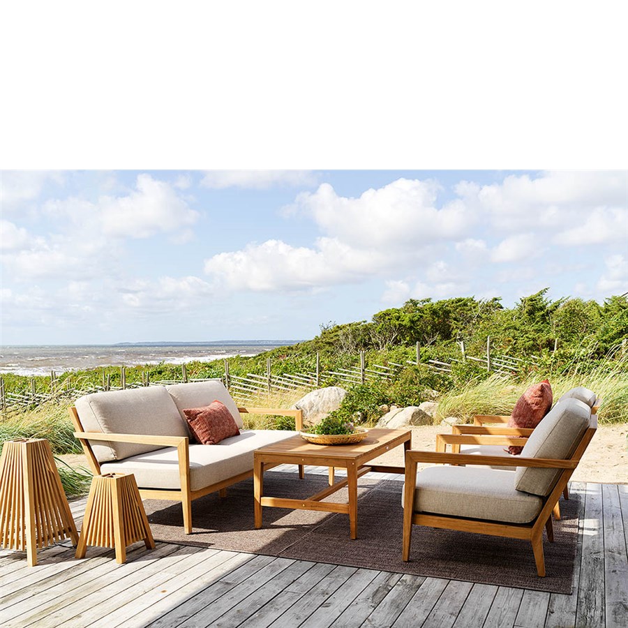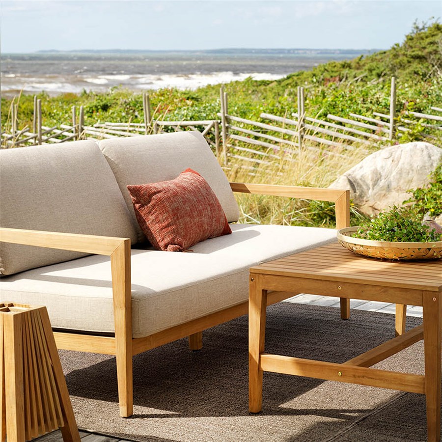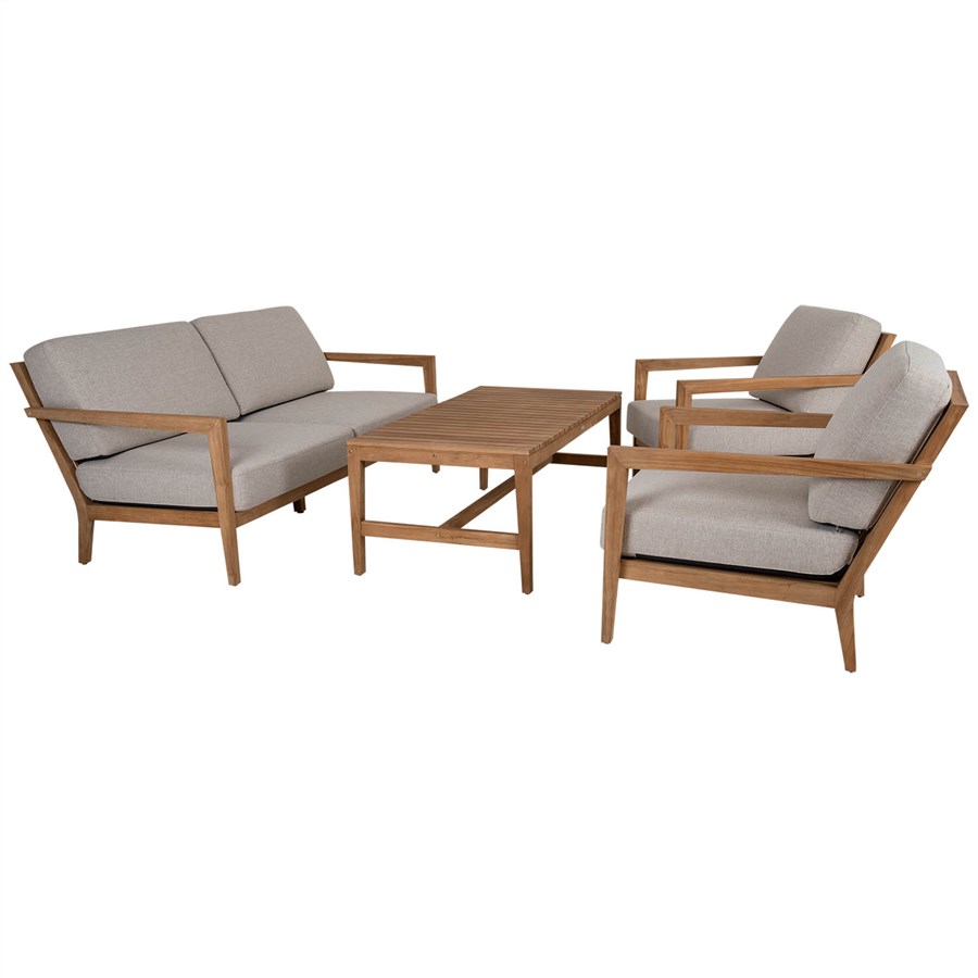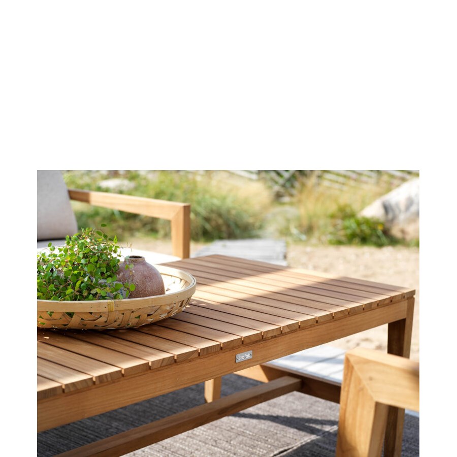 Populär 2,5 sits soffa i teak med dynor i högdensitetsskum i olefintyg med vattenavvisande beläggning. I samma serie finns även fåtöljer och bord.
