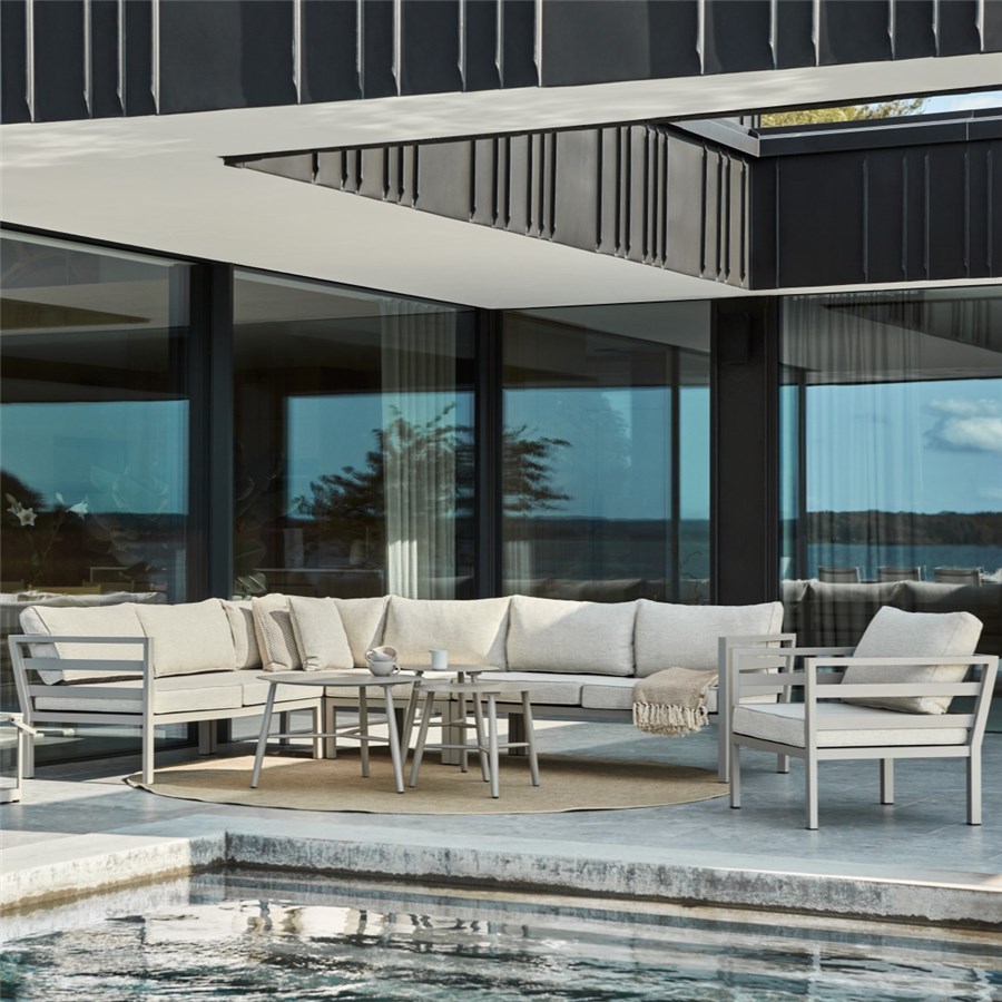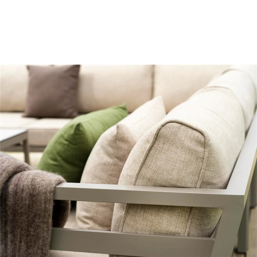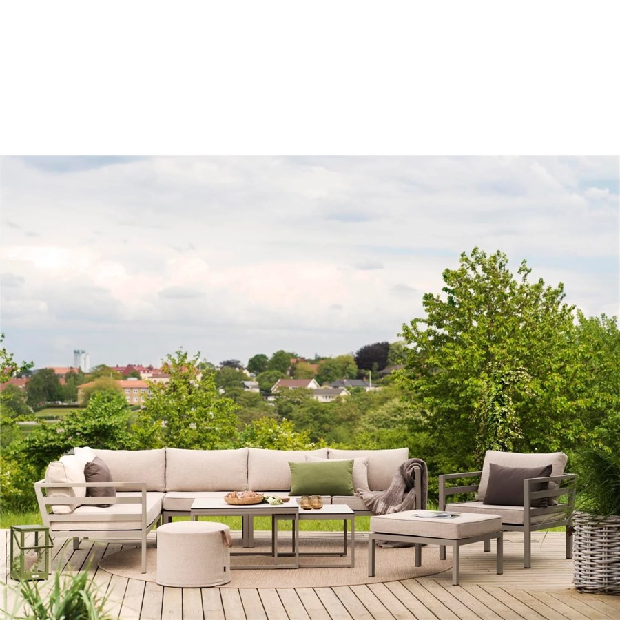 Weldon är gjord av mattlackerad khakifärgad aluminiumstomme med allvädersdynor. Priset avser 2-sits, hörn, 2-sits men exkl bord.