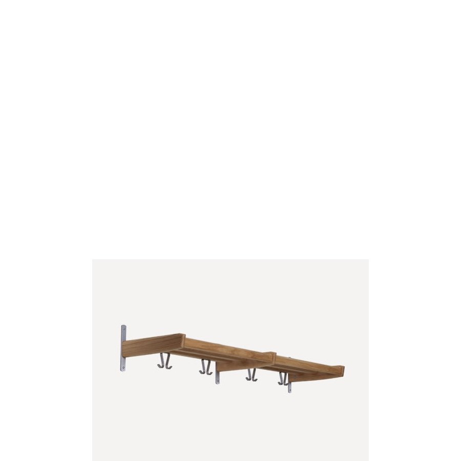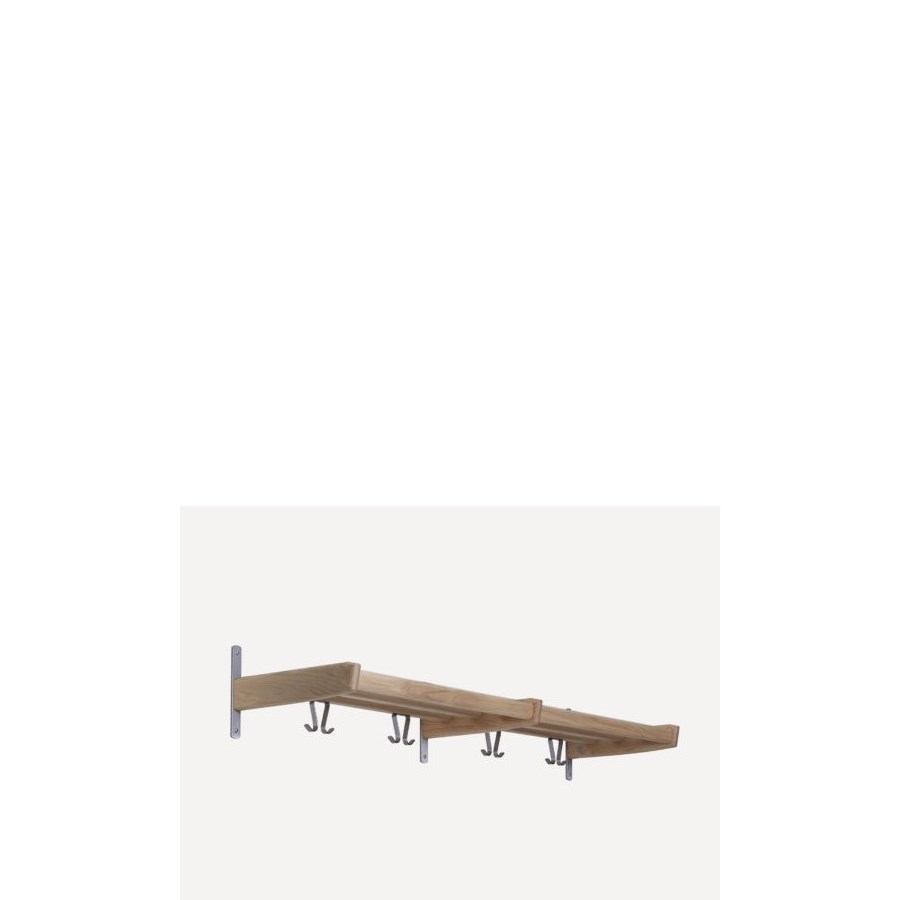 Meja hatthylla med ett hyllplan och detaljer i slipat stål. Hyllan finns i tre olika längder i oljad ek, vitoljad ek, rökt ek, svartbetsad ek och vitlack. Galgar ingår ej.