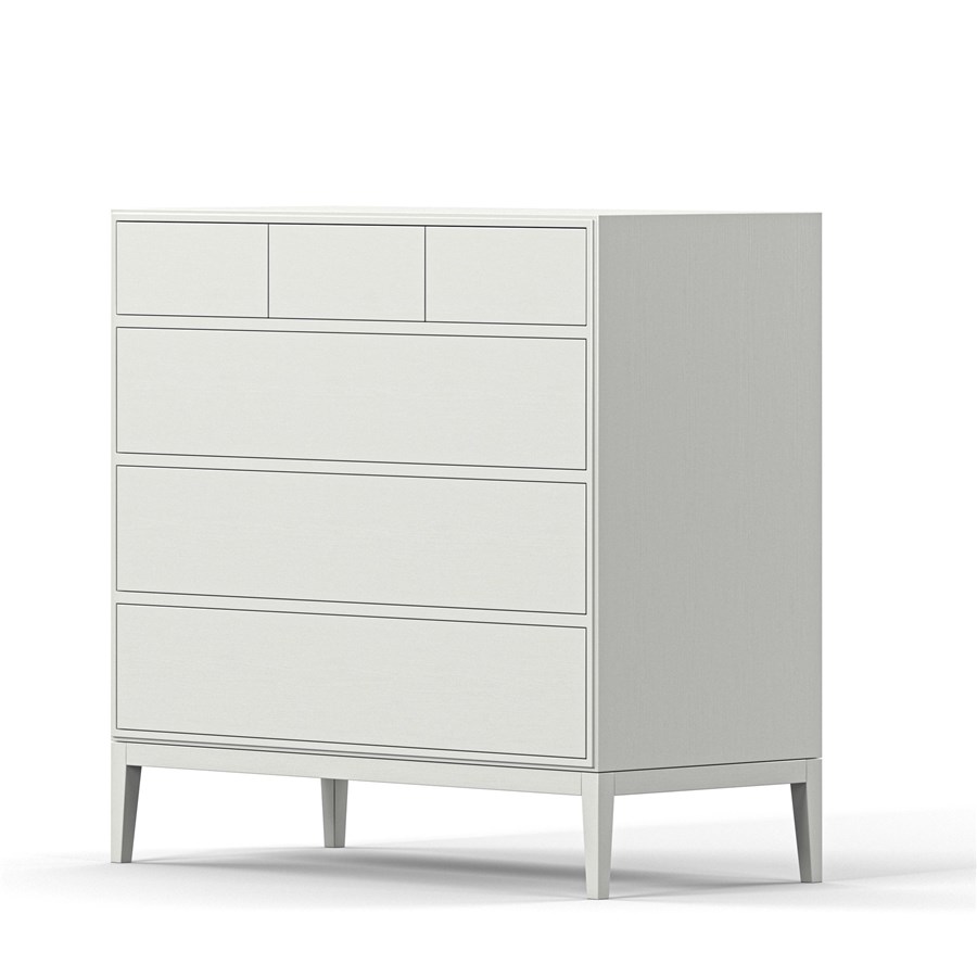 En byrå med tre stora lådor och tre mindre. Lådorna öppnas genom att trycka på dom. Välj mellan målade ben eller betsade ekben.