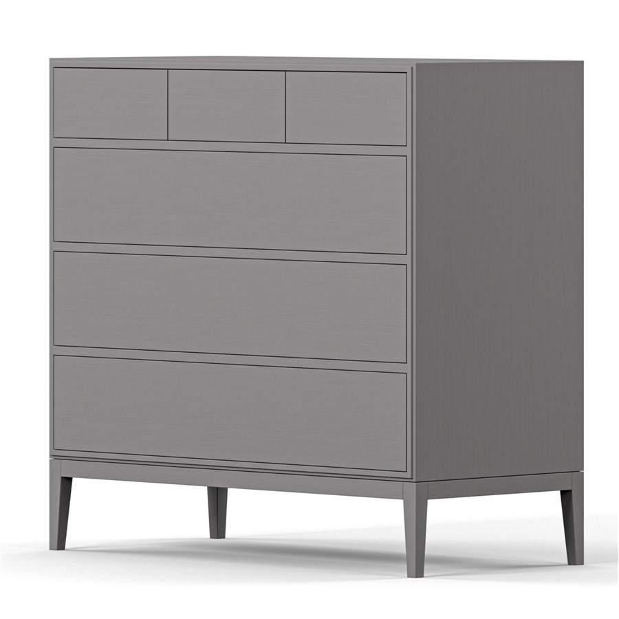 En byrå med tre stora lådor och tre mindre. Lådorna öppnas genom att trycka på dom. Välj mellan målade ben eller betsade ekben.
