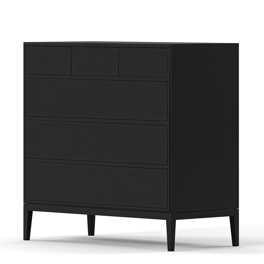 En byrå med tre stora lådor och tre mindre. Lådorna öppnas genom att trycka på dom. Välj mellan målade ben eller betsade ekben.