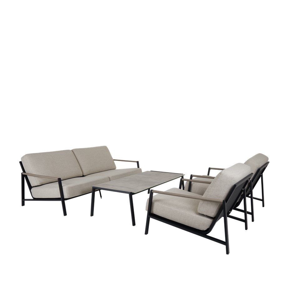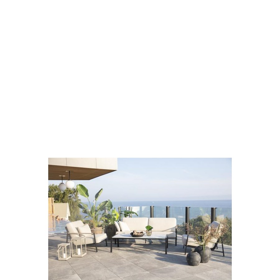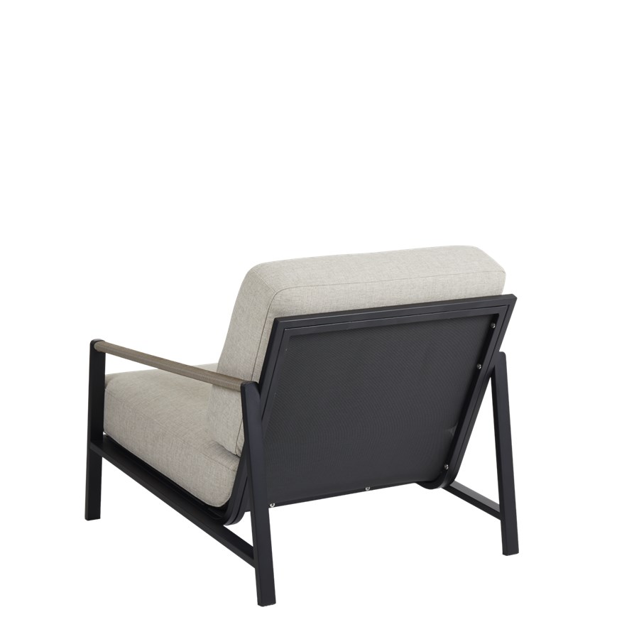 Lyra fåtölj består av stomme i svart pulverlackerat rostfritt stål, med vackra detaljer av konstrotting på armstöden, och med dynor i fordrat olefintyg med vattenavvisande beläggning.