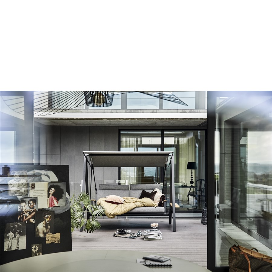 En modern och högklassisk hammock med stilrena linjer. Hammocken har praktiska avlastningsytor på sidorna. Tillverkad av aluminium med trädetaljer i teak. Komplett med tak och dynor.