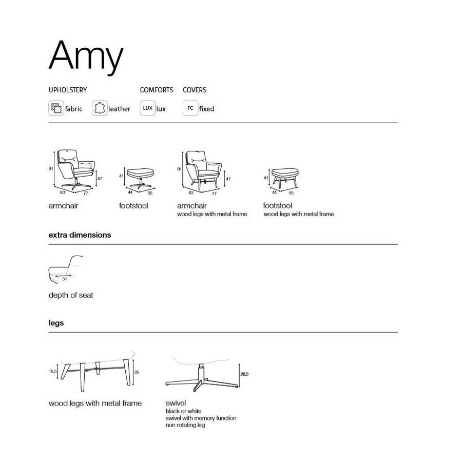 Fåtölj Amy finns i både tyg och läder med snurr eller fasta ben. Pris avser snurr i tyg 4.