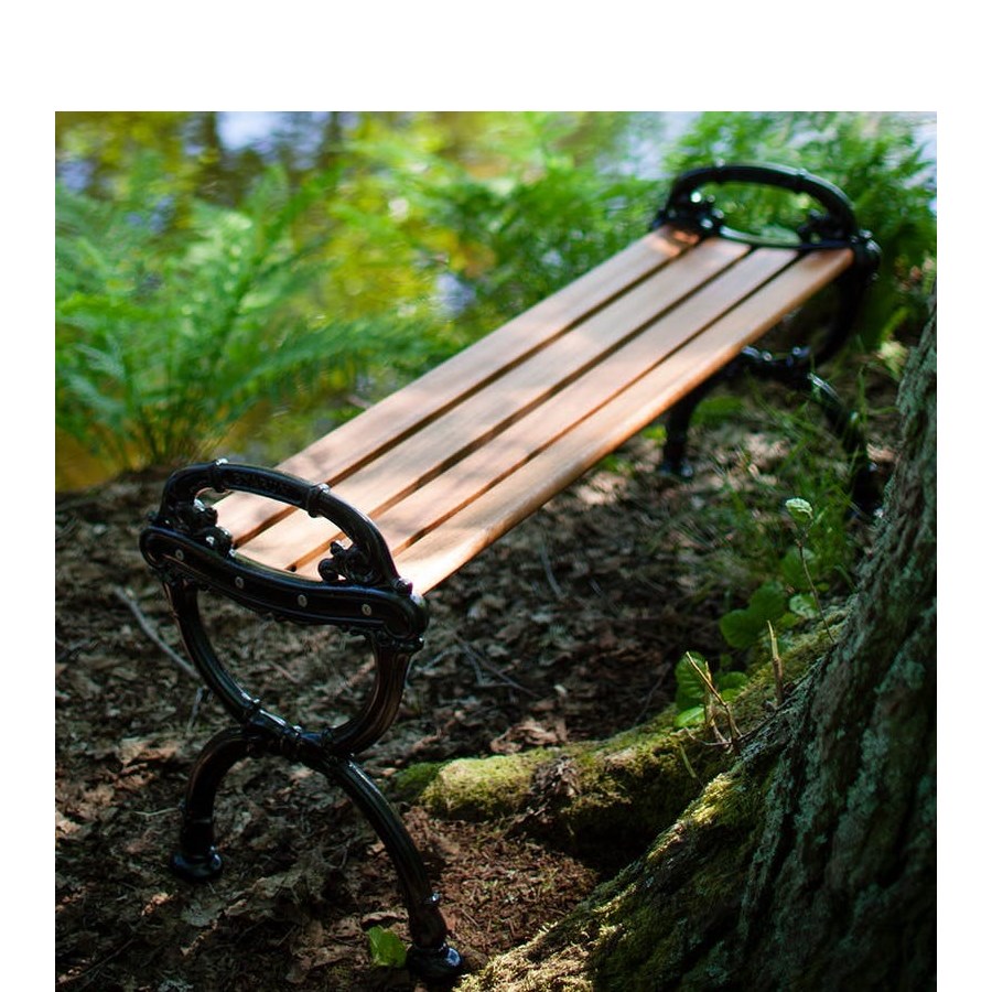 Bänk i impregnerad fur, brunlaserad fur, vitlackerad fur eller oljad mahogny i svartlackerad, vitlackerad, grönlackerad eller natur gjutgodsutförande. Priset avser bänk i impregnerad fur.