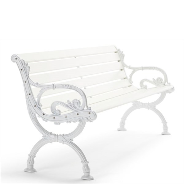 Bänk i impregnerad fur, brunlaserad fur, vitlackerad fur eller oljad mahogny i svartlackerad, vitlackerad, grönlackerad eller natur gjutgodsutförande. Finns i längd 125 cm, 155 cm eller 185 cm. Priset avser storlek 155 cm i vitlackerad fur.
