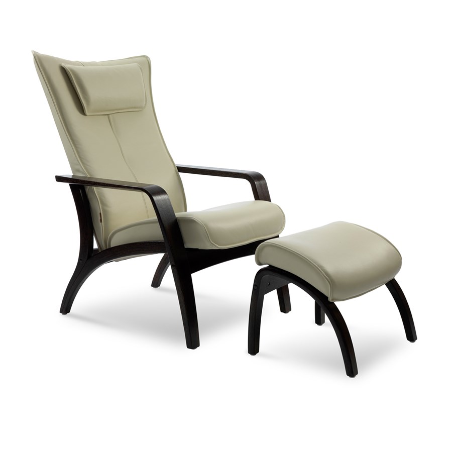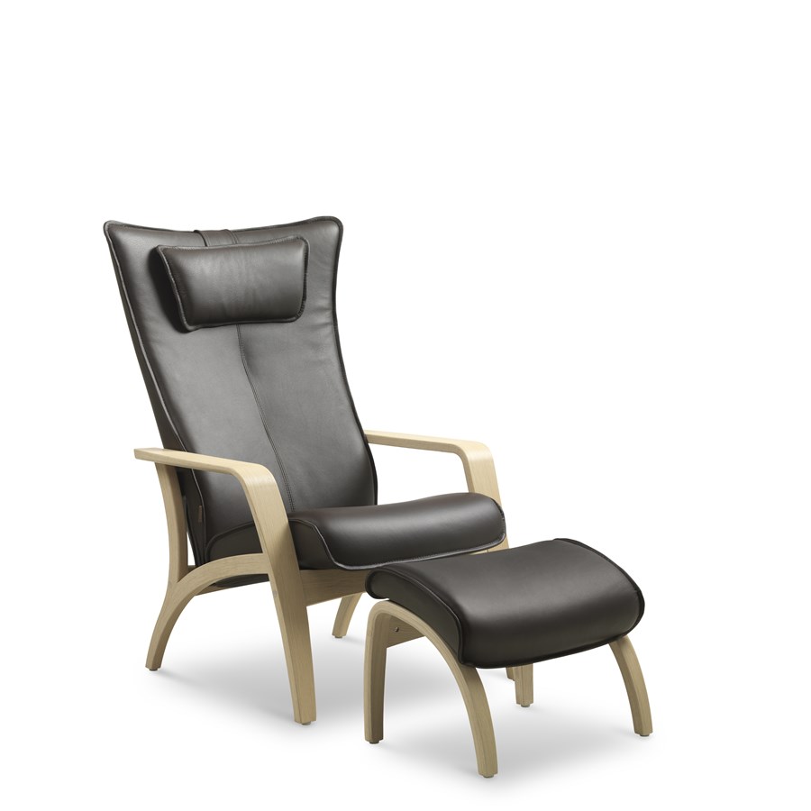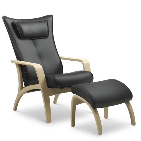 Fåtölj med reglerbar rygg och aktivt nackstöd. Pris avser fåtölj i svart läder inkl pall.