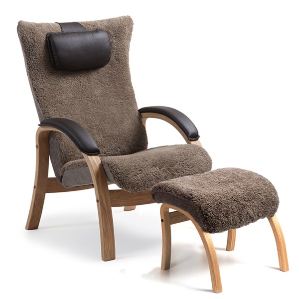 Fåtölj Easy med pall i oljad ek och med armstödskuddar. Finns i fårskinn grafit, charcoal eller sahara.