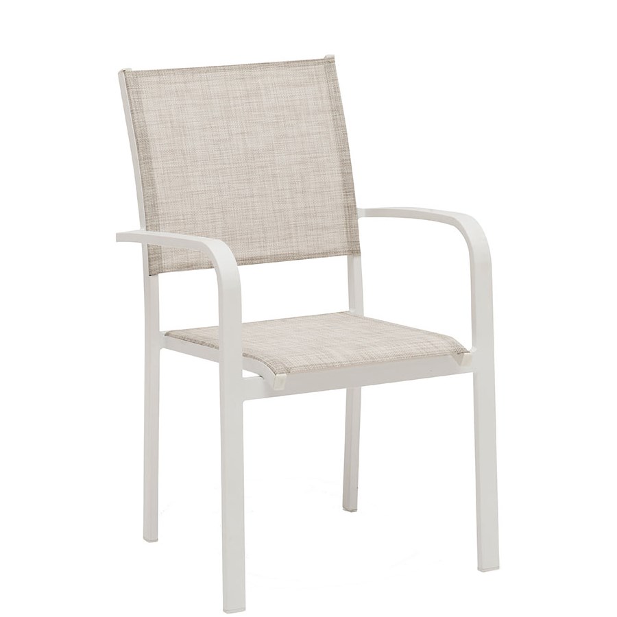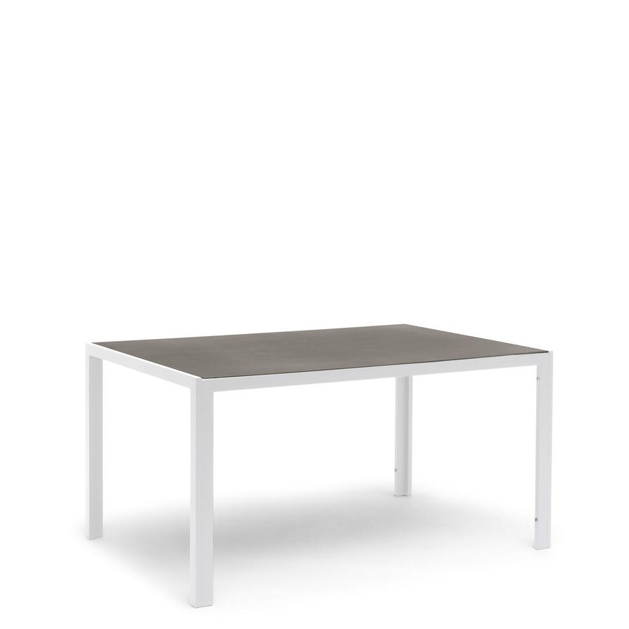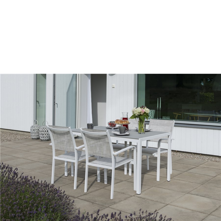 Hånger är en stilren och lättskött möbelgrupp i vit aluminium och textilen. Pris avser bord 140x90 + 4 stapelstolar.