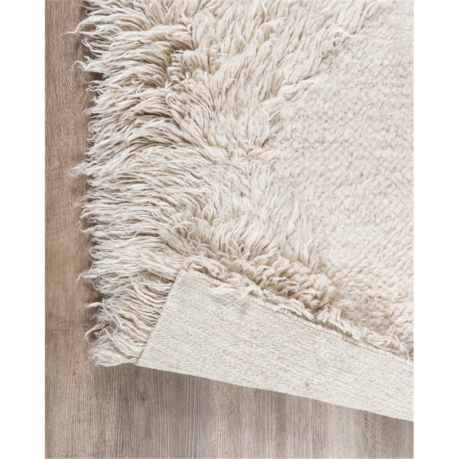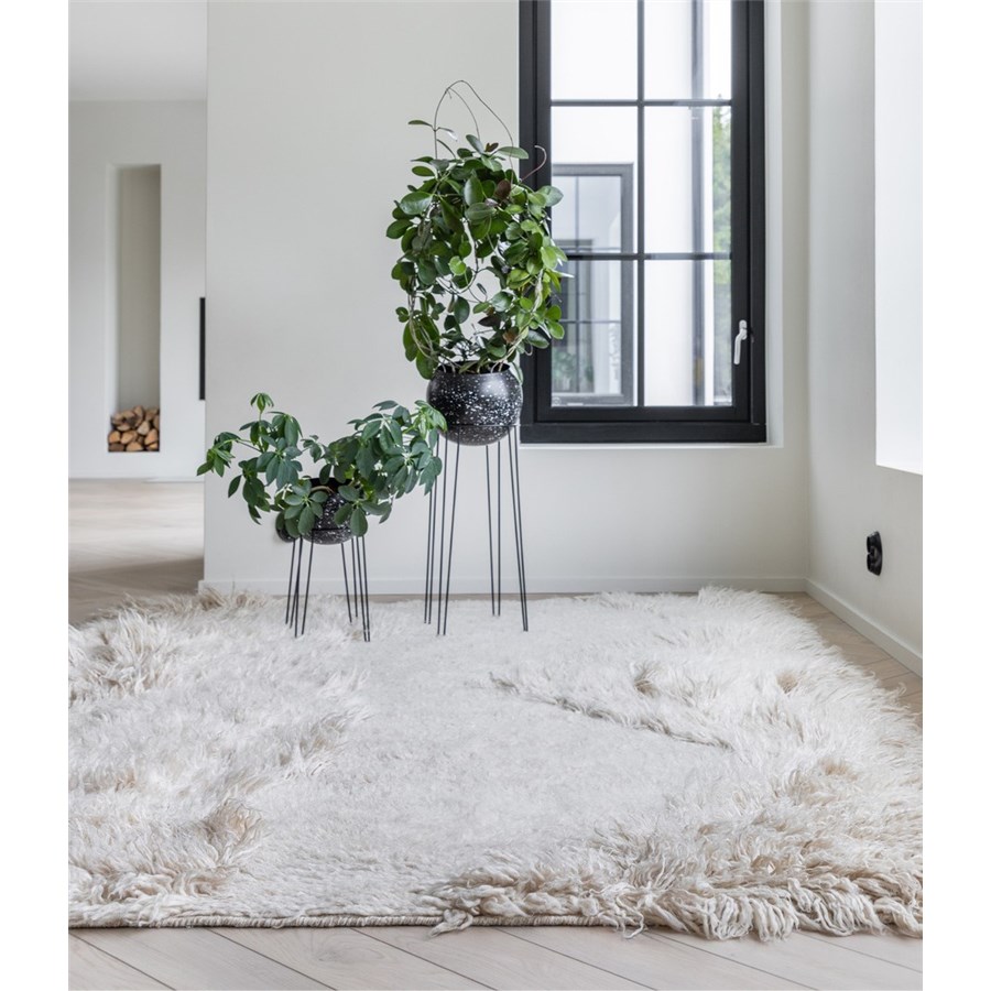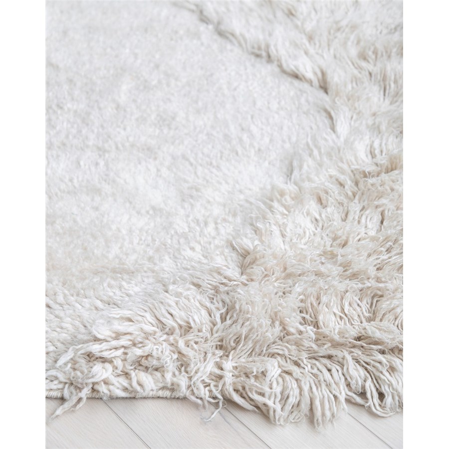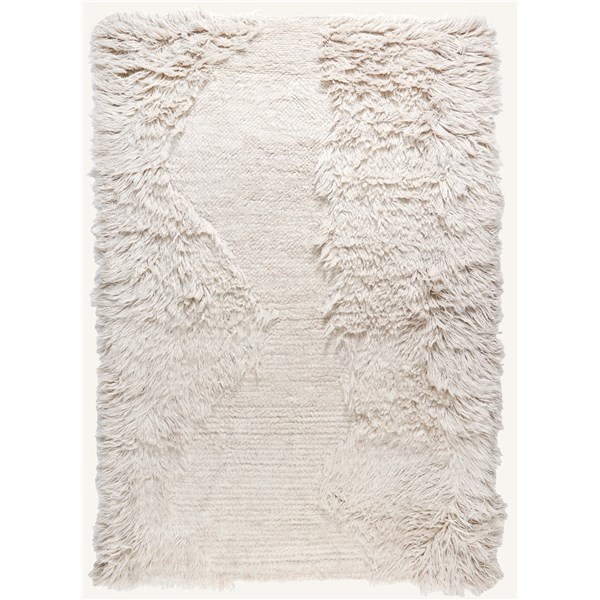 Lazy är en handvävd ullmatta i en ljust beige färgton. Mattan har olika lugglängder där två oregelbundna partier med lång tjock lugg kombineras med ett parti i mitten av mattan där lugglängden är kort.